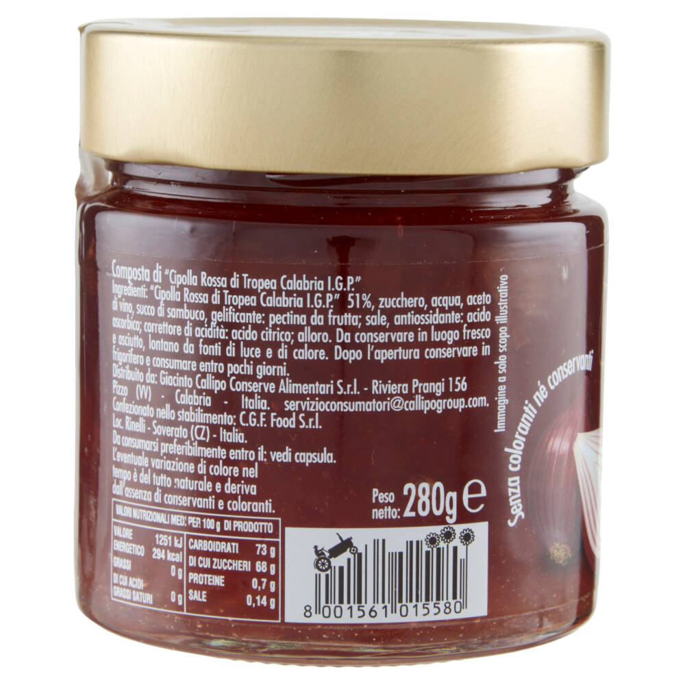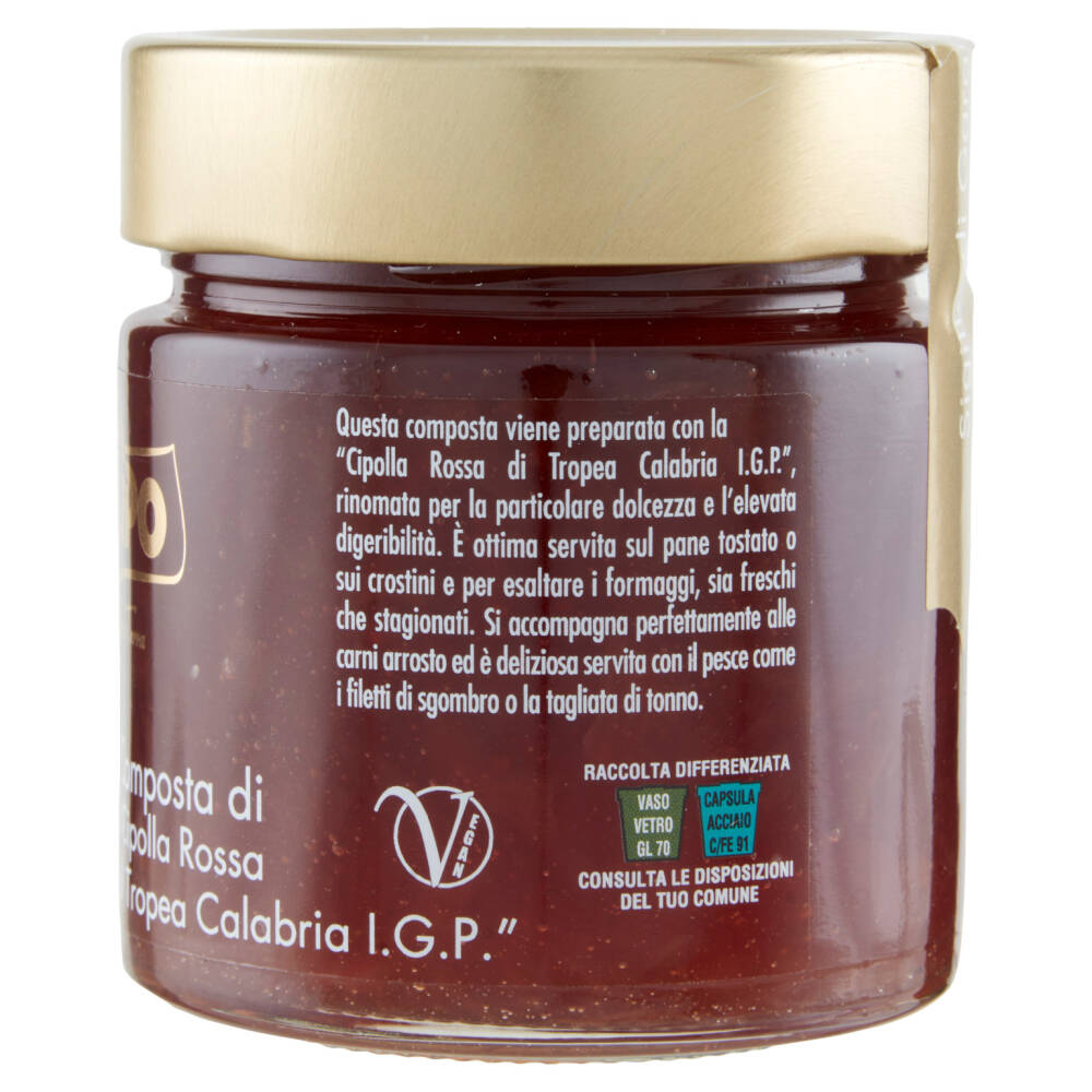 Questa composta viene preparata con la "Cipolla Rossa di Tropea Calabria I.G.P.", rinomata per la particolare dolcezza e l'elevata digeribilità. È ottima servita sul pane tostato o sui crostini e per esaltare i formaggi, sia freschi che stagionati. Si accompagna perfettamente alle carni arrosto ed è deliziosa servita con il pesce come i filetti di sgombro o la tagliata di tonno.