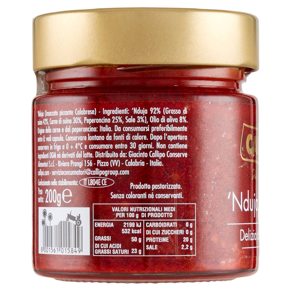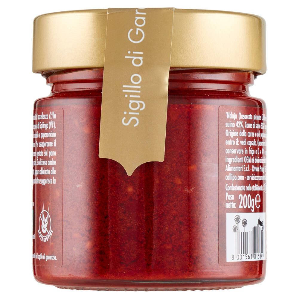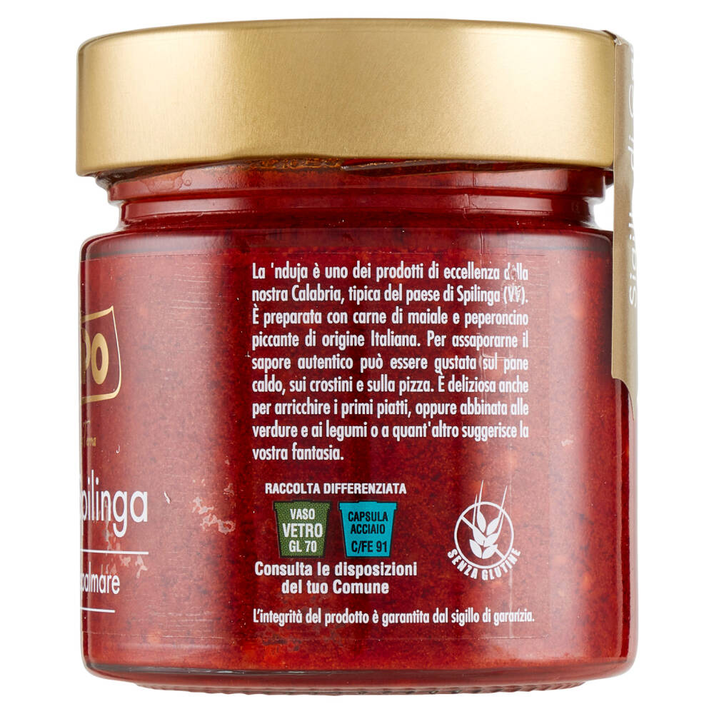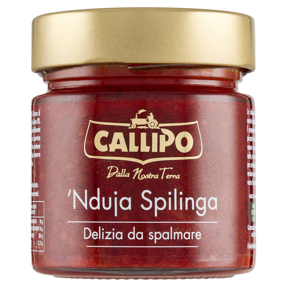 La 'nduja è uno dei prodotti di eccellenza della nostra Calabria, tipica del paese di Spilinga (VV). È preparata con carne di maiale e peperoncino piccante di origine Italiana. Per assaporarne il sapore autentico può essere gustata sul pane caldo, sui crostini e sulla pizza. È deliziosa anche per arricchire i primi piatti, oppure abbinata alle verdure e ai legumi o a quant'altro suggerisce la vostra fantasia.