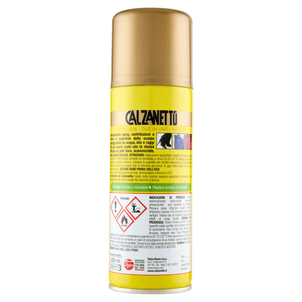 Istruzioni: dopo avere spazzolato l'oggetto da trattare, erogare Calzanetto Antiacqua tenendo la bombola a circa 20-25 cm di distanza. Distribuire il prodotto in maniera uniforme. Limitare la quantità allo stretto necessario e non disperdere il prodotto nell'aria per evitare che si formino accumuli di gas infiammabili. Non usare su materiali plastici. Agitare bene prima dell'uso.