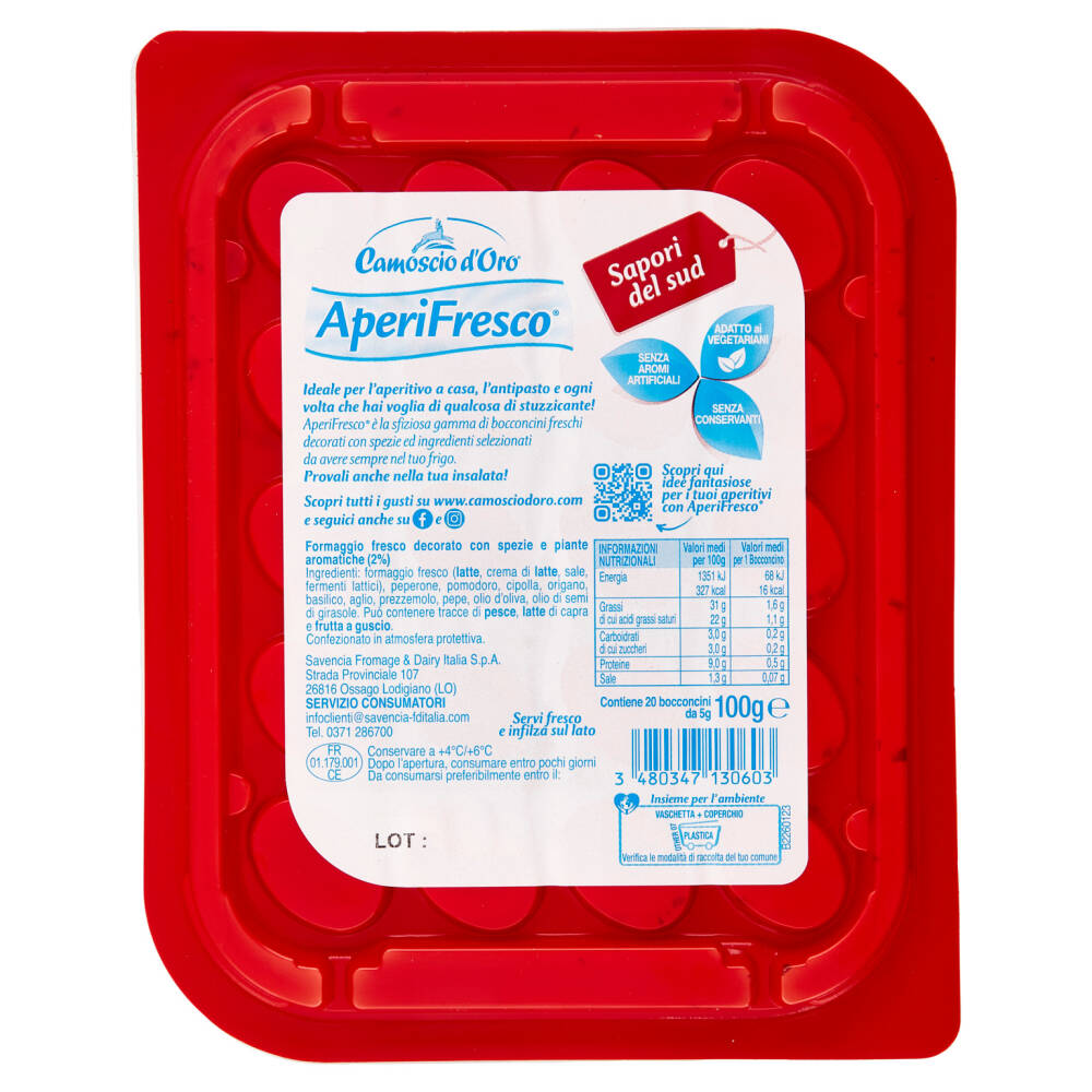 Formaggio fresco (latte, crema di latte, sale, fermenti lattici) Peperone Pomodoro Cipolla Origano Basilico Aglio Prezzemolo Pepe Olio d'oliva Olio di semi di girasole Può contenere tracce di pesce, latte di capra e frutta a guscio