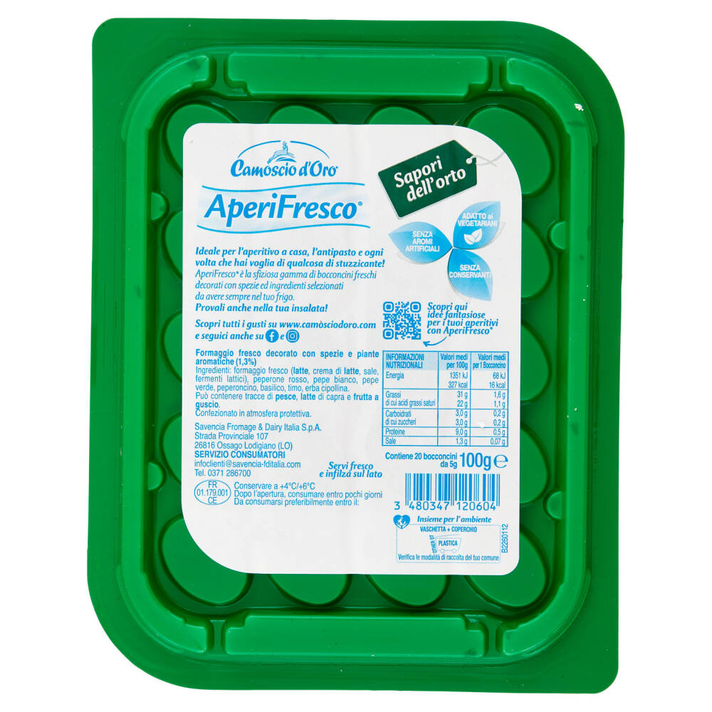 Formaggio fresco (latte, crema di latte, sale, fermenti lattici) Peperone rosso Pepe bianco Pepe verde Peperoncino Basilico Timo Erba cipollina Può contenere tracce di pesce, latte di capra e frutta a guscio