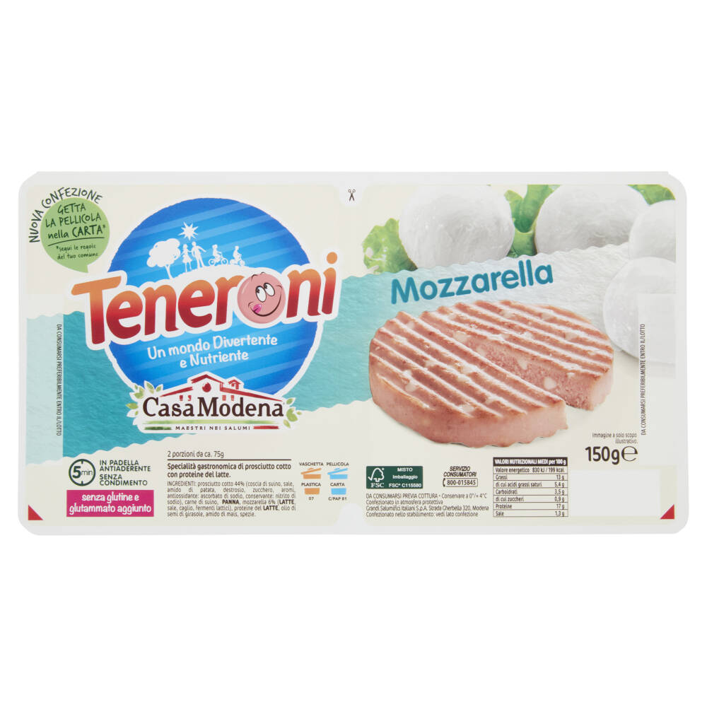 Prosciutto cotto 44% (coscia di suino, sale, amido di patata, destrosio, zucchero, aromi, antiossidante: ascorbato di sodio, conservante: nitrito di sodio) Carne di suino Panna Mozzarella 6% (latte, sale, caglio, fermenti lattici) Proteine del latte Olio di semi di girasole Amido di mais Spezie