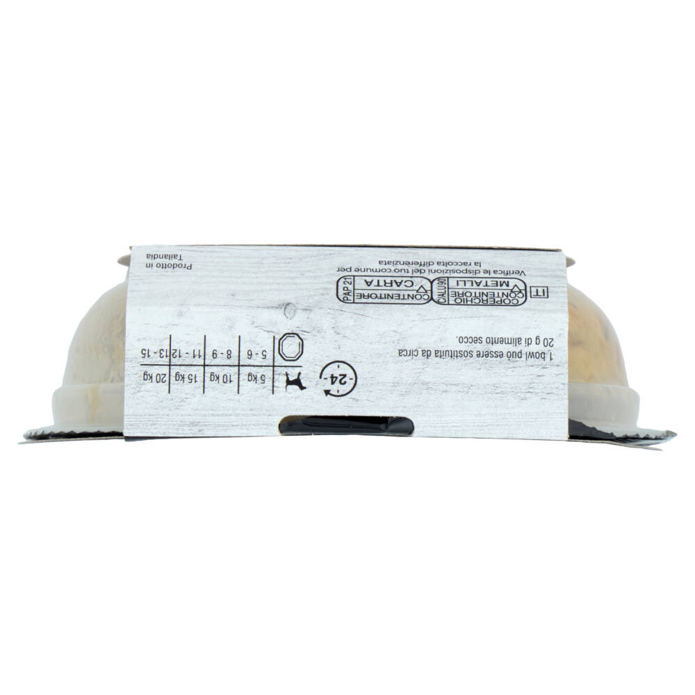 Quantità d'impiego e modalità d'uso: Calcolare le calorie derivanti dagli snack. Regola la quantità di alimento in base alle esigenze del tuo cane. Come? Visita il nostro sito. Lasciare sempre a disposizione dell'acqua fresca. Servire a temperatura ambiente, conservare in frigorifero per 2 giorni. 24h - Peso del cane: 5 kg | Bowl: 5 - 6 Peso del cane: 10 kg | Bowl: 8 - 9 Peso del cane: 15 kg | Bowl: 11 - 12 Peso del cane: 20 kg | Bowl: 13 - 15 1 bowl può essere sostituita da circa 20 g di alimento secco.