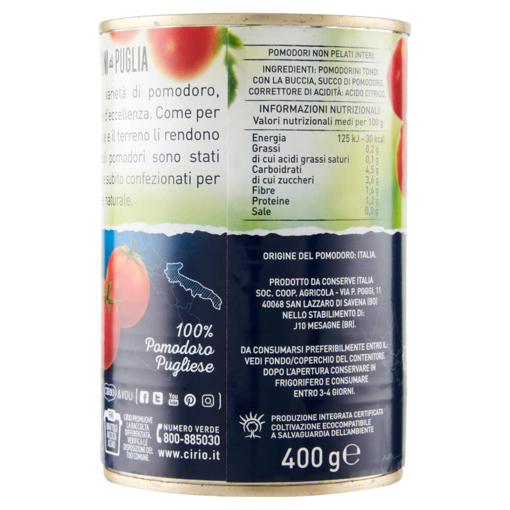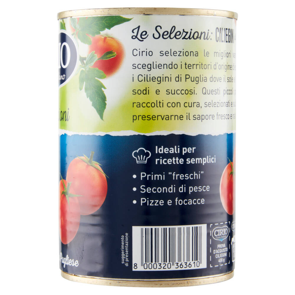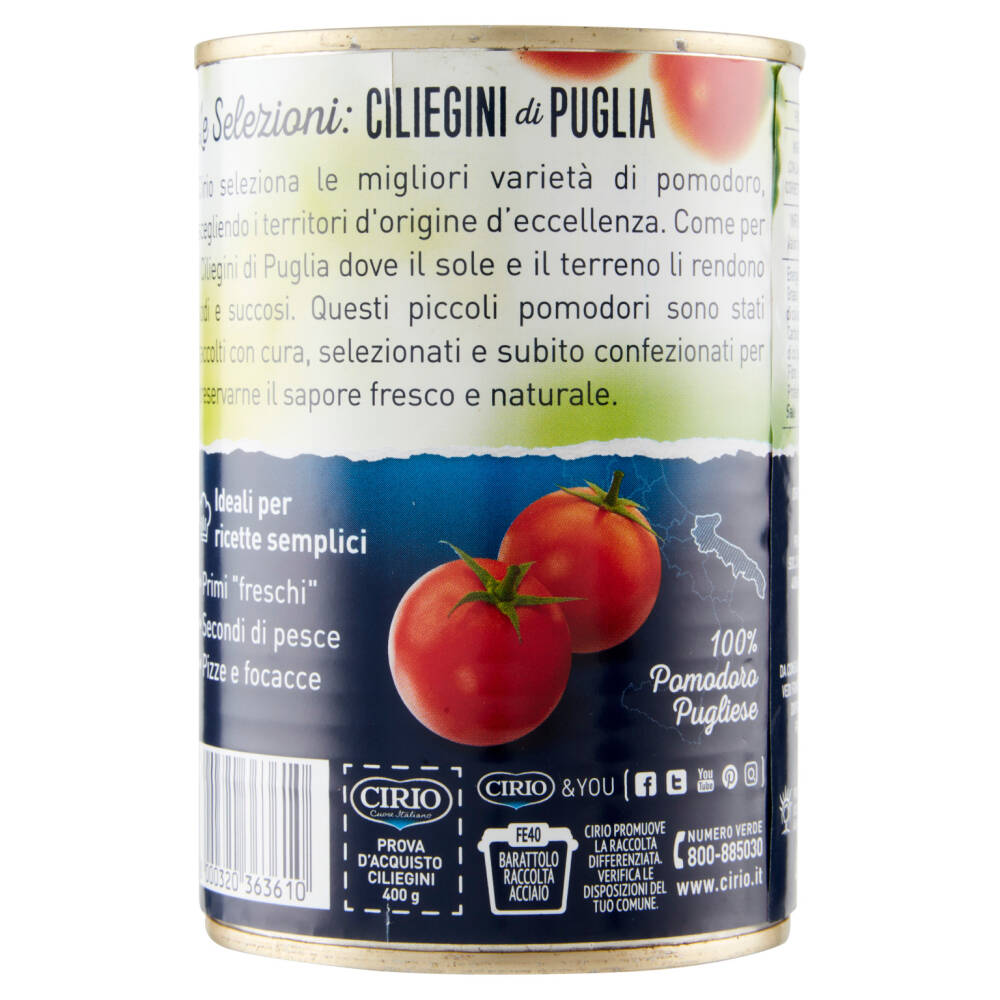 Cirio seleziona le migliori varietà di pomodoro, scegliendo i territori d'origine d'eccellenza. Come per i Ciliegini di Puglia dove il sole e il terreno li rendono sodi e succosi. Questi piccoli pomodori sono stati raccolti con cura, selezionati e subito confezionati per preservarne il sapore fresco e naturale.
