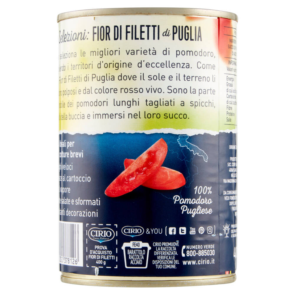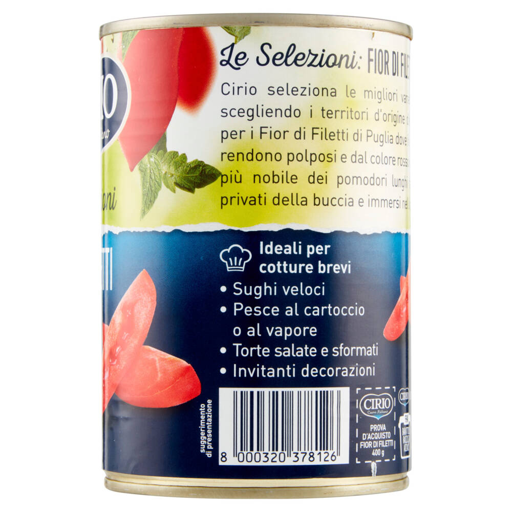 Le Selezioni Cirio sono nate per portare in tavola delle vere specialità, come i Fiori di Filetti: la parte più nobile dei pomodori lunghi tagliati a spicchi, senza buccia e conservati con il loro succo. Così delicati e succosi, sono adatti alle cotture veloci, come sughi, torte salate e sformati o per invitanti insalate di pasta.