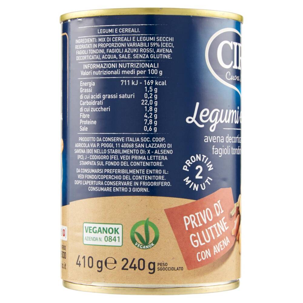 Mix di cereali e legumi secchi reidratati in proporzioni variabili 59% (ceci, fagioli tondini, fagioli azuki rossi, avena decorticata) Acqua Sale Senza glutine