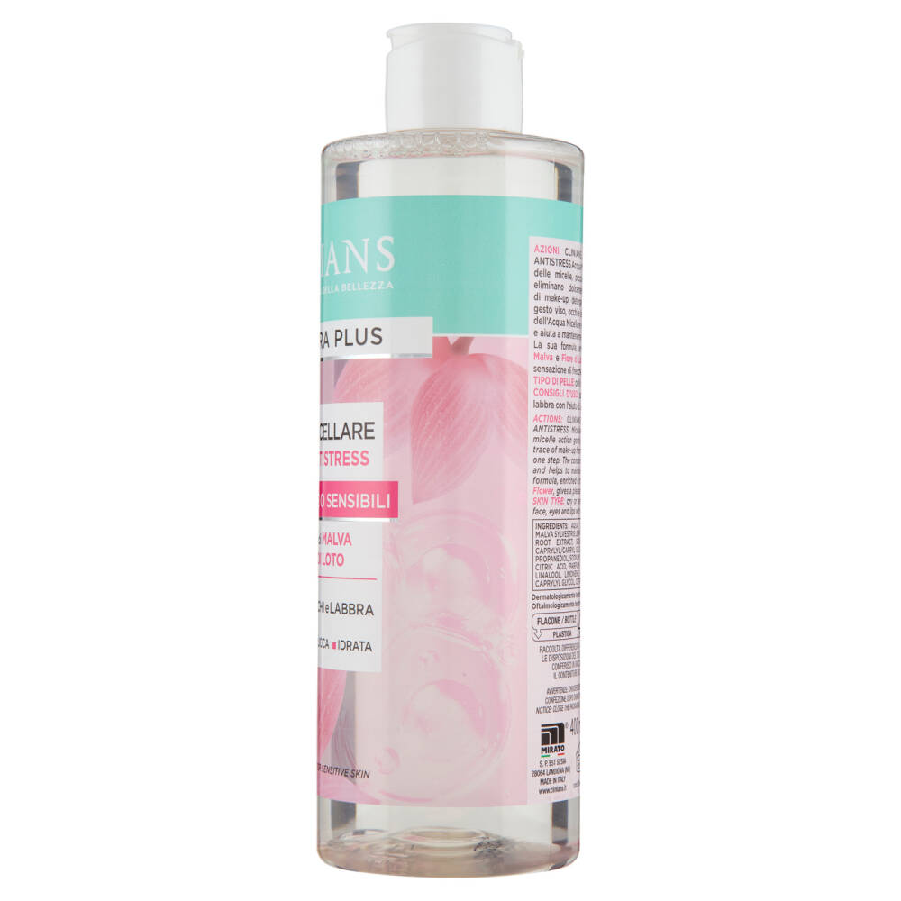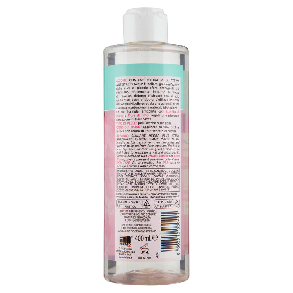 Azioni: Clinians Hydra Plus Attiva Antistress Acqua Micellare, grazie all'azione delle micelle, piccole sfere detergenti che eliminano dolcemente impurità e tracce di make-up, deterge e strucca con un solo gesto viso, occhi e labbra. L'utilizzo costante dell'Acqua Micellare regala una pelle più pulita e aiuta a mantenerne la naturale idratazione. La sua formula, arricchita con Estratto di Malva e Fiore di Loto, regala una piacevole sensazione di freschezza.