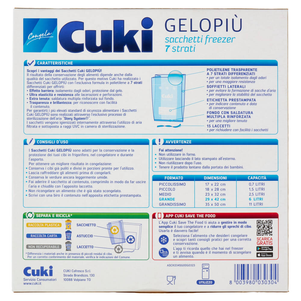 I sacchetti Cuki Gelopiù sono adatti per la conservazione e la protezione dei tuoi cibi in frigorifero, nel congelatore e durante l'asporto.