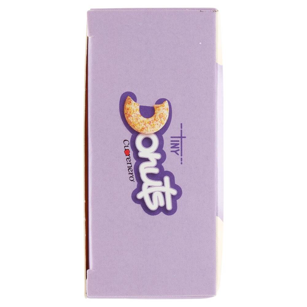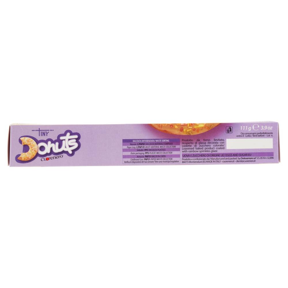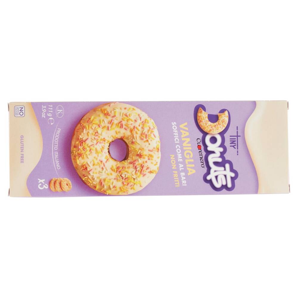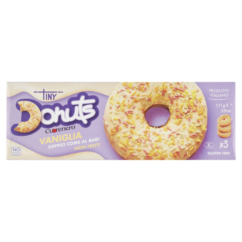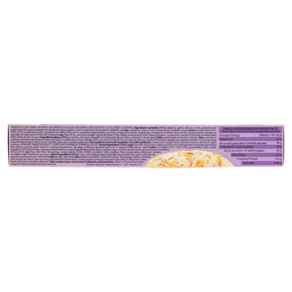 Ingredienti ciambella (75%): uova da gallina allevate a terra, preparato per pasticceria (oli e grassi vegetali non idrogenati (grassi (palma, cocco e palmisti in proporzione variabile), oli (soia e girasole e colza e mais in proporzione variabile)), acqua, burro, emulsionanti: E471, E475, E322; conservante: E202; correttore di acidità: E330; aromi, colorante: betacarotene), zucchero, amido di frumento deglutinato, sciroppo di sorbitolo, farina di riso, fecola di patate, sciroppo di glucosio, emulsionanti: E472b, E477; farina di soia, fibra di riso, aroma di vaniglia, agenti lievitanti: E336i, E500ii; emulsionante: E464; fibra di psyllium, conservante: sorbato di potassio; emulsionante: E481; farina di semi di guar
