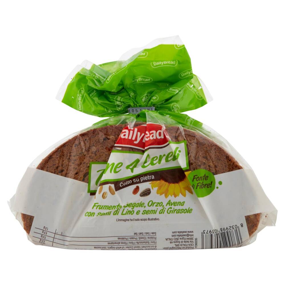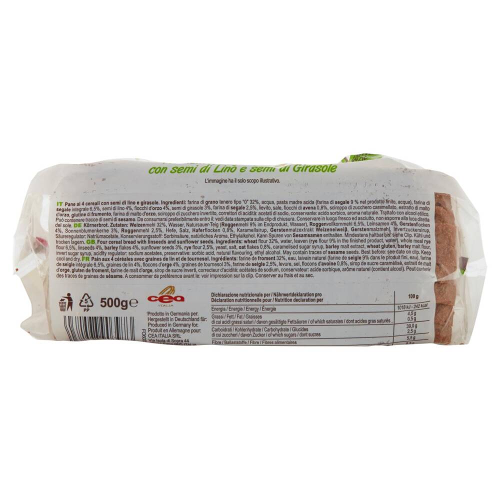 Farina integrale di grano tenero tipo "0" 32% Acqua Pasta madre acida (farina di segale 9% nel prodotto finito, acqua) Farina di segale integrale 6,5% Semi di lino 4% Fiocchi d'orzo 4% Semi di girasole 3% Farina di segale 2,5% Lievito Sale Fiocchi di avena 0,8% Sciroppo di zucchero caramellato Estratto di malto d'orzo Glutine di frumento Farina di malto d'orzo Sciroppo di zucchero invertito Correttori di acidità: acetati di sodio Conservante: acido sorbico Aroma naturale Trattato con alcool etilico Può contenere tracce di semi di sesamo, soia, senape e lupini
