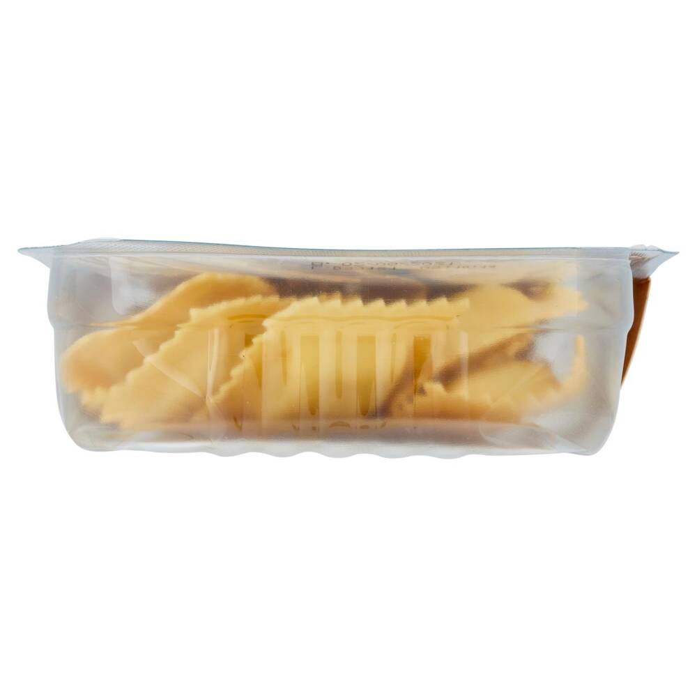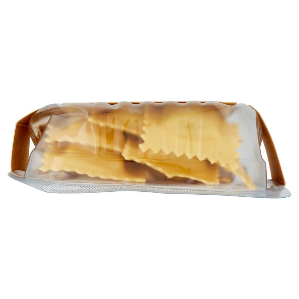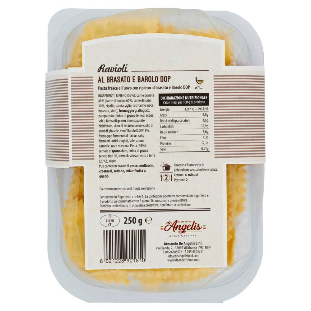 Ripieno (52%): carne brasata 48% (carne di bovino 60%, carne di suino 30%, cipolla, carota, aglio, rosmarino, noce moscata, vino), formaggio grattugiato, pangrattato (farina di grano tenero, acqua, sale), farina di grano tenero, patate disidratate, siero di latte in polvere, olio di semi di girasole, vino "Barolo D.O.P." 3%, formaggio Emmenthal (latte, sale, fermenti lattici, caglio), sale, aroma naturale, noce moscata