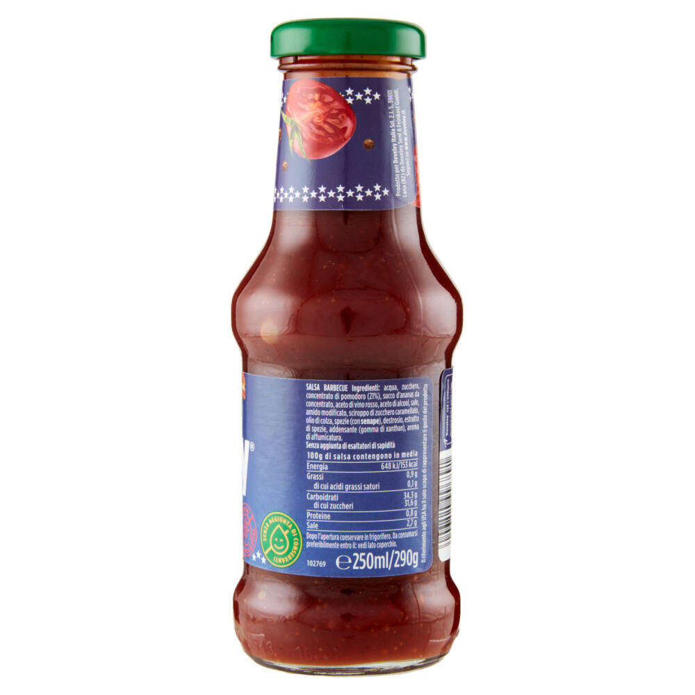 Acqua Zucchero Concentrato di pomodoro (21%) Succo d'ananas da concentrato Aceto di vino rosso Aceto di alcool Sale Amido modificato Sciroppo di zucchero caramellato Olio di colza Spezie (con senape) Destrosio Estratto di spezie Addensante (gomma di xanthan) Aroma di affumicatura Senza aggiunta di esaltatori di sapidità