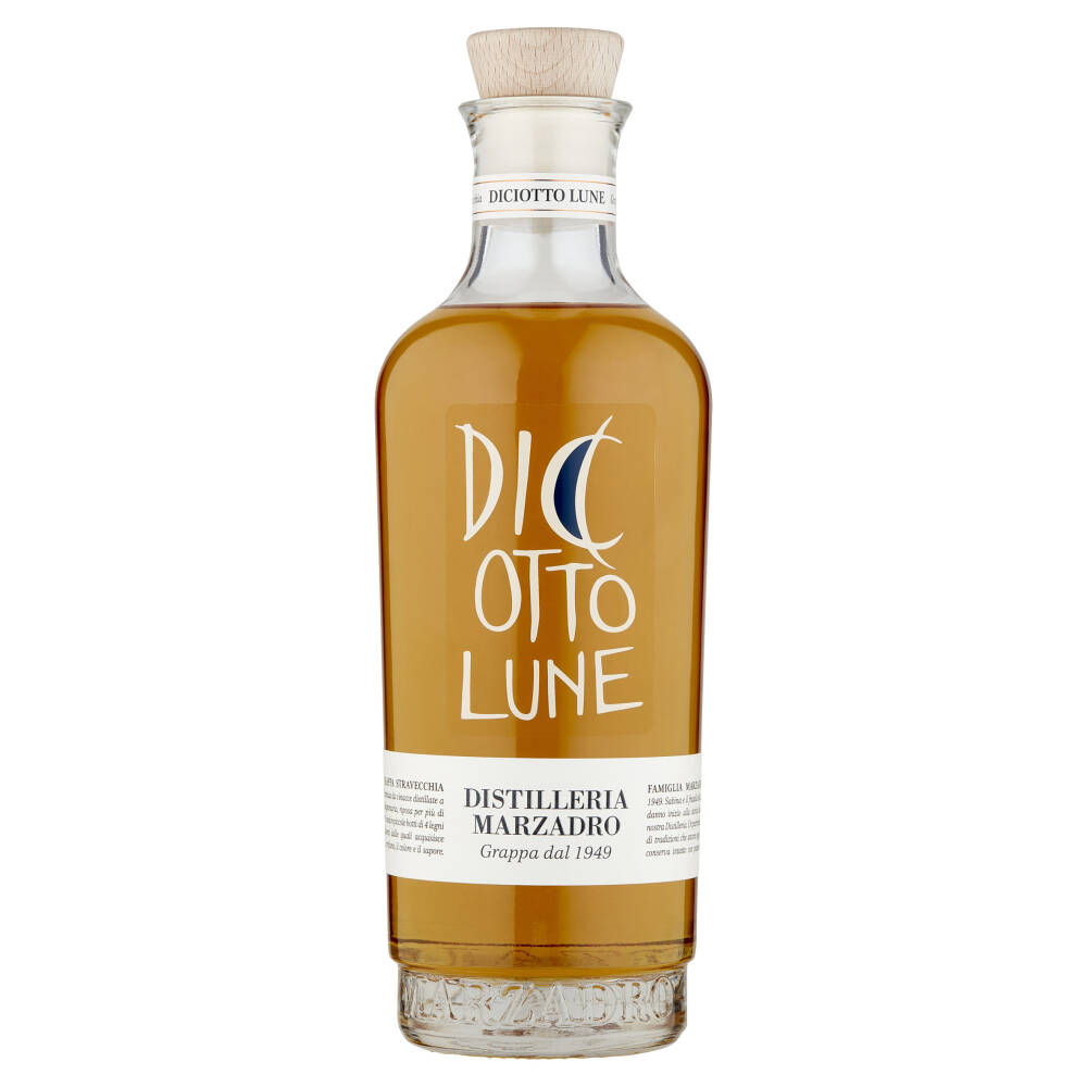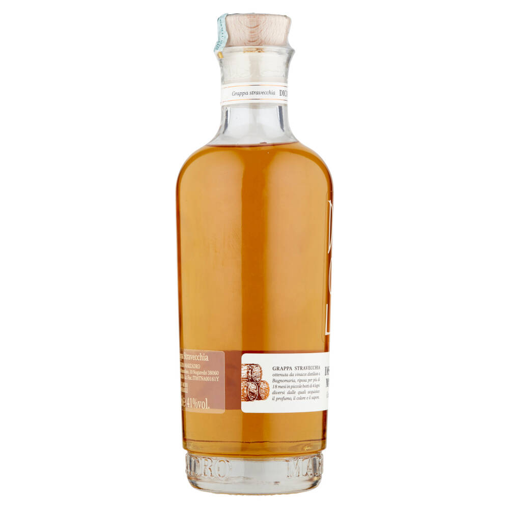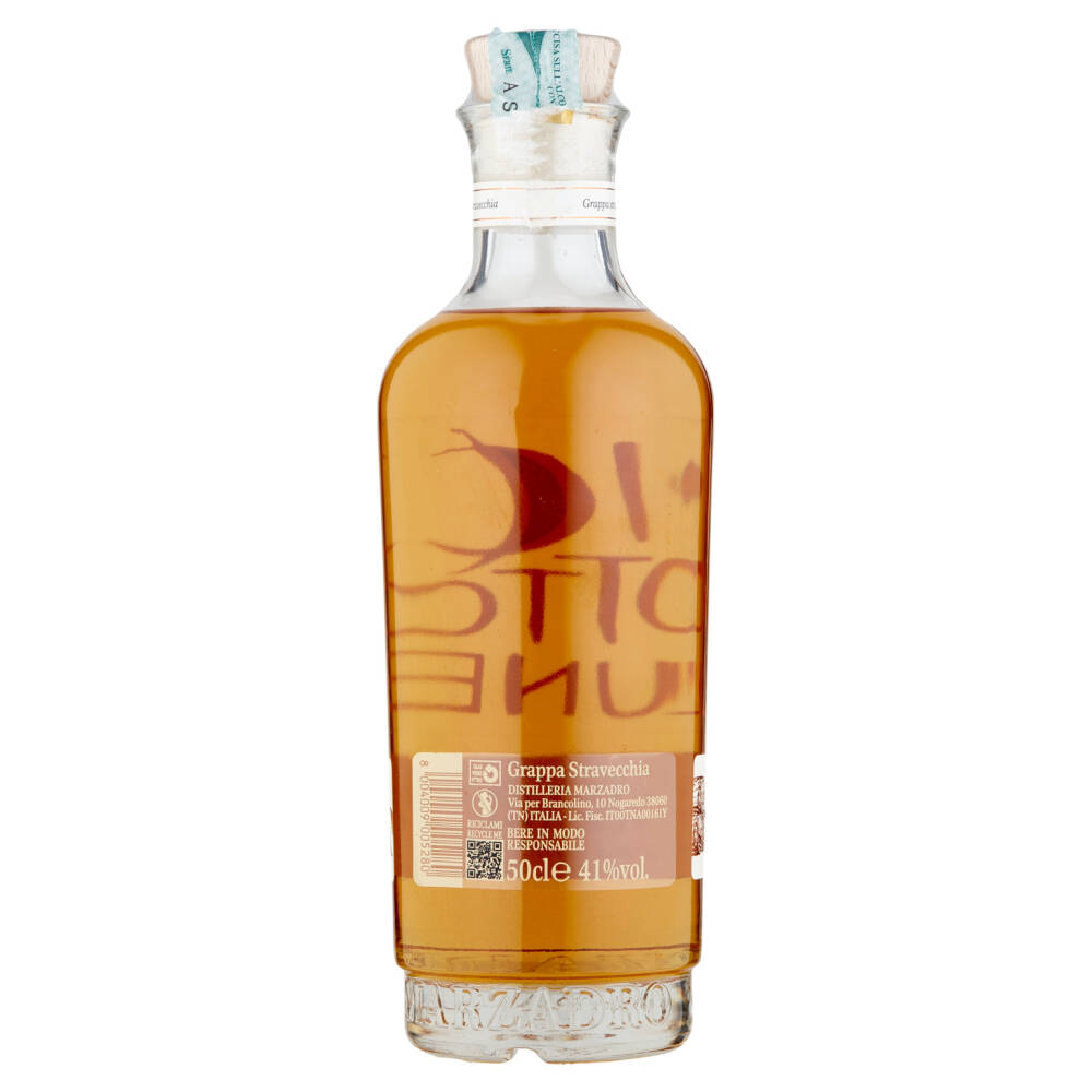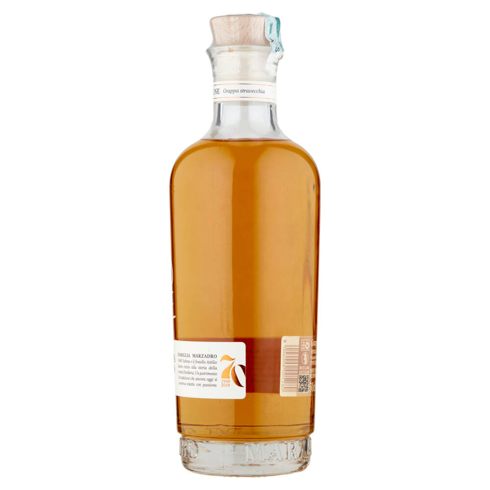 Grappa Stravecchia ottenuta da vinacce distillate a Bagnomaria, riposa per più di 18 mesi in piccole botti di 4 legni diversi dalle quali acquisisce il profumo, il calore e il sapore.