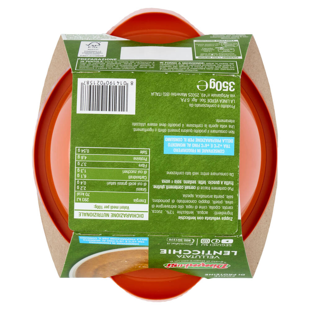 Acqua Lenticchie 13% Zucca Carota Cipolla Cime di rapa Olio extravergine di oliva Piselli Doppio concentrato di pomodoro Sale Pianta aromatica Spezia Può contenere tracce di cereali contenenti glutine, frutta a guscio, latte, sedano, soia e uova