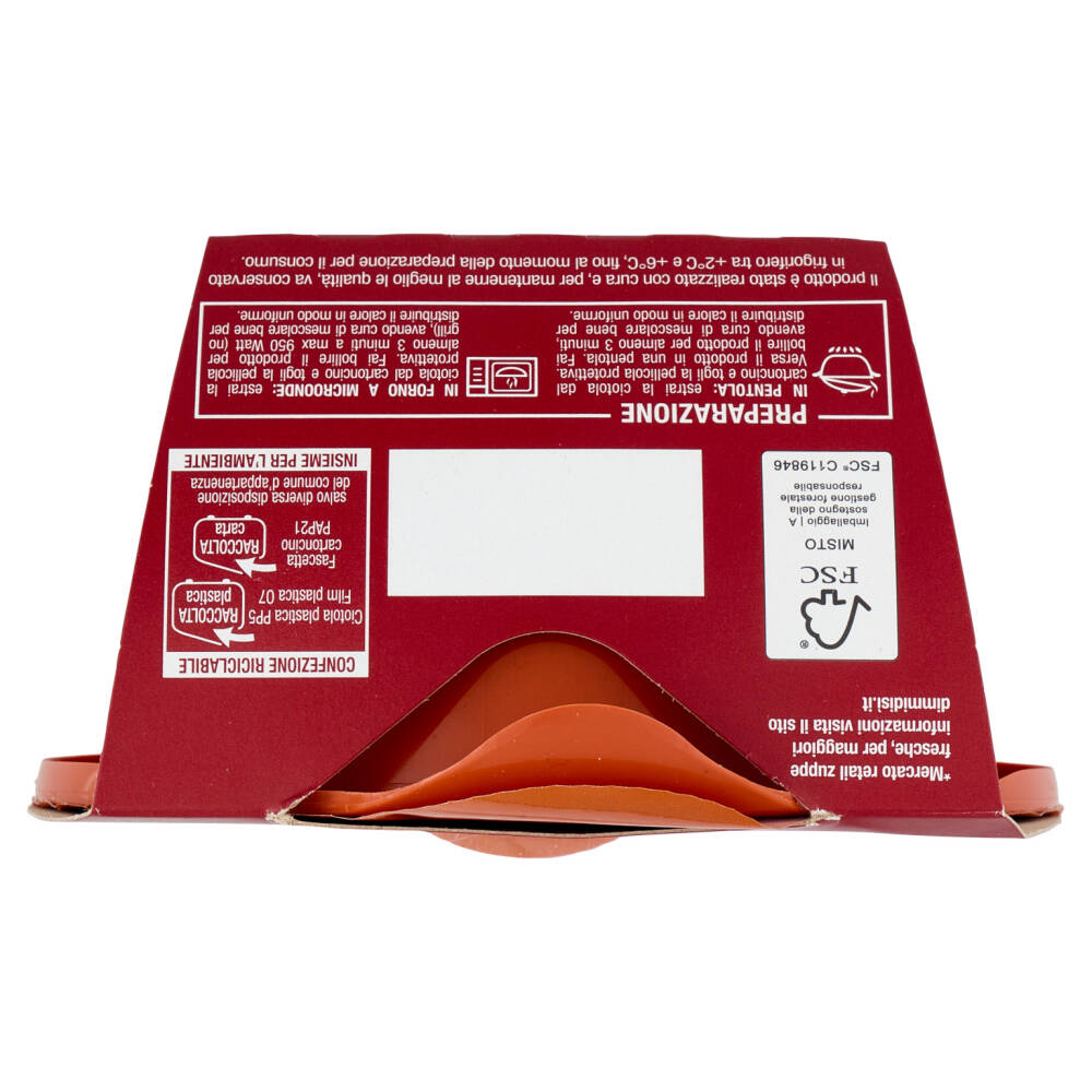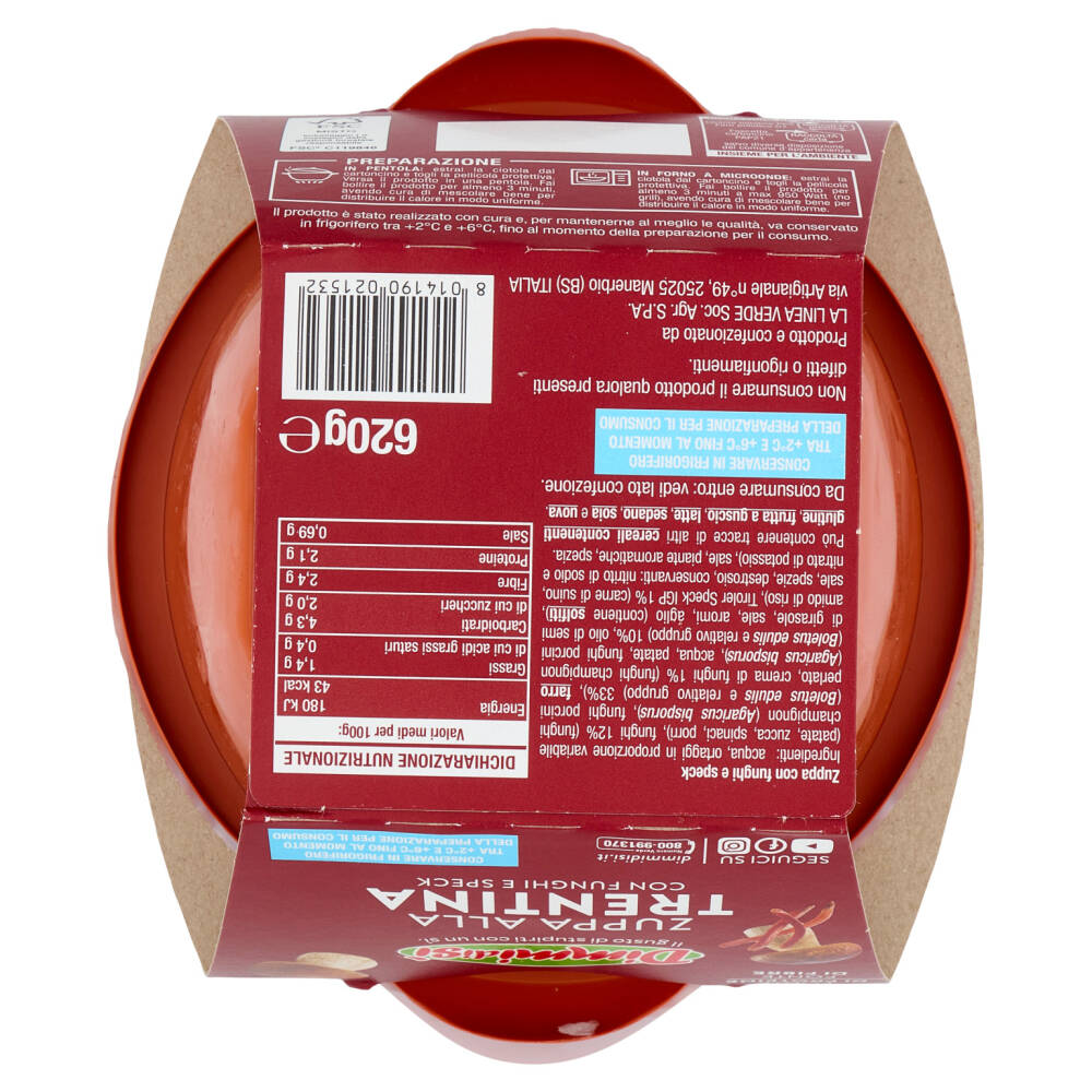 Crema di funghi 1% (funghi champignon (Agaricus bisporus), acqua, patate, funghi porcini (Boletus edulis e relativo gruppo) 10%, olio di semi di girasole, sale, aromi, aglio (contiene solfiti), amido di riso)