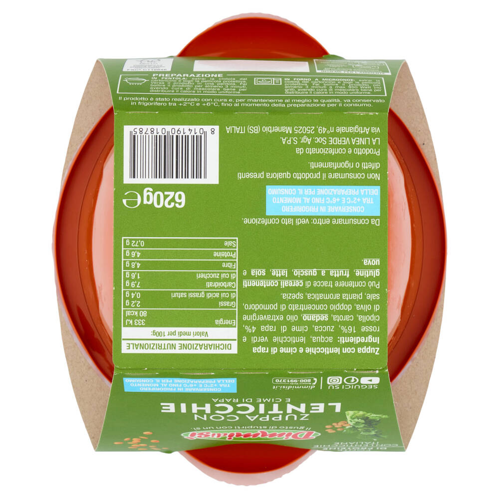 Acqua Lenticchie verdi e rosse 16% Zucca Cime di rapa 4% Cipolla Carota Sedano Olio extravergine di oliva Doppio concentrato di pomodoro Sale Pianta aromatica Spezia Può contenere tracce di cereali contenenti glutine, frutta a guscio, latte, soia e uova