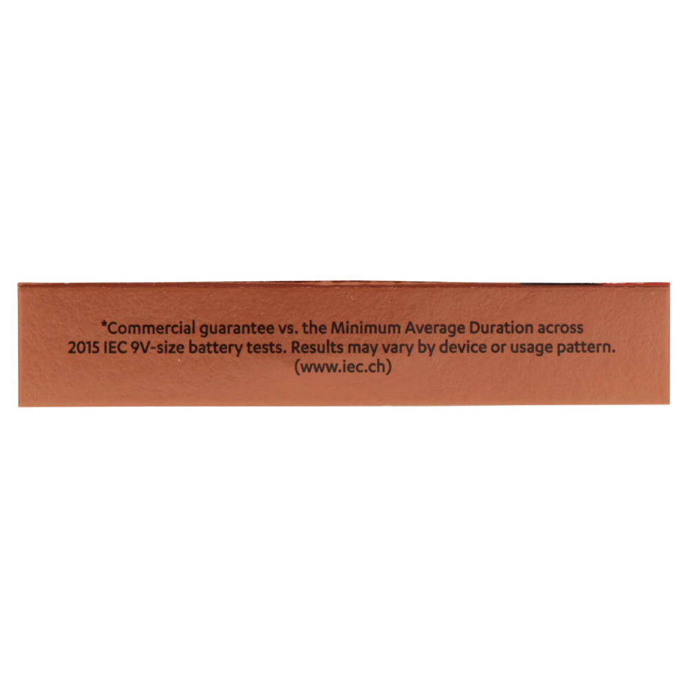 100% Durata garantita* *Garanzia commerciale rispetto alla Durata Media Minima nei test IEC 2015 per le batterie formato 9V. I risultati possono variare a seconda del dispositivo e delle modalità di utilizzo. (www.iec.ch)