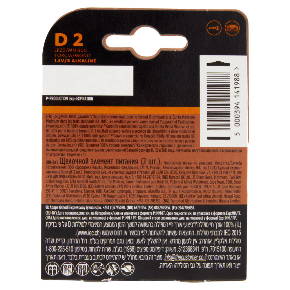 100% Durata garantita* *Garanzia commerciale rispetto alla Durata Media Minima nei test IEC 2015 per le batterie formato D. I risultati possono variare a seconda del dispositivo e delle modalità di utilizzo. (www.iec.ch)
