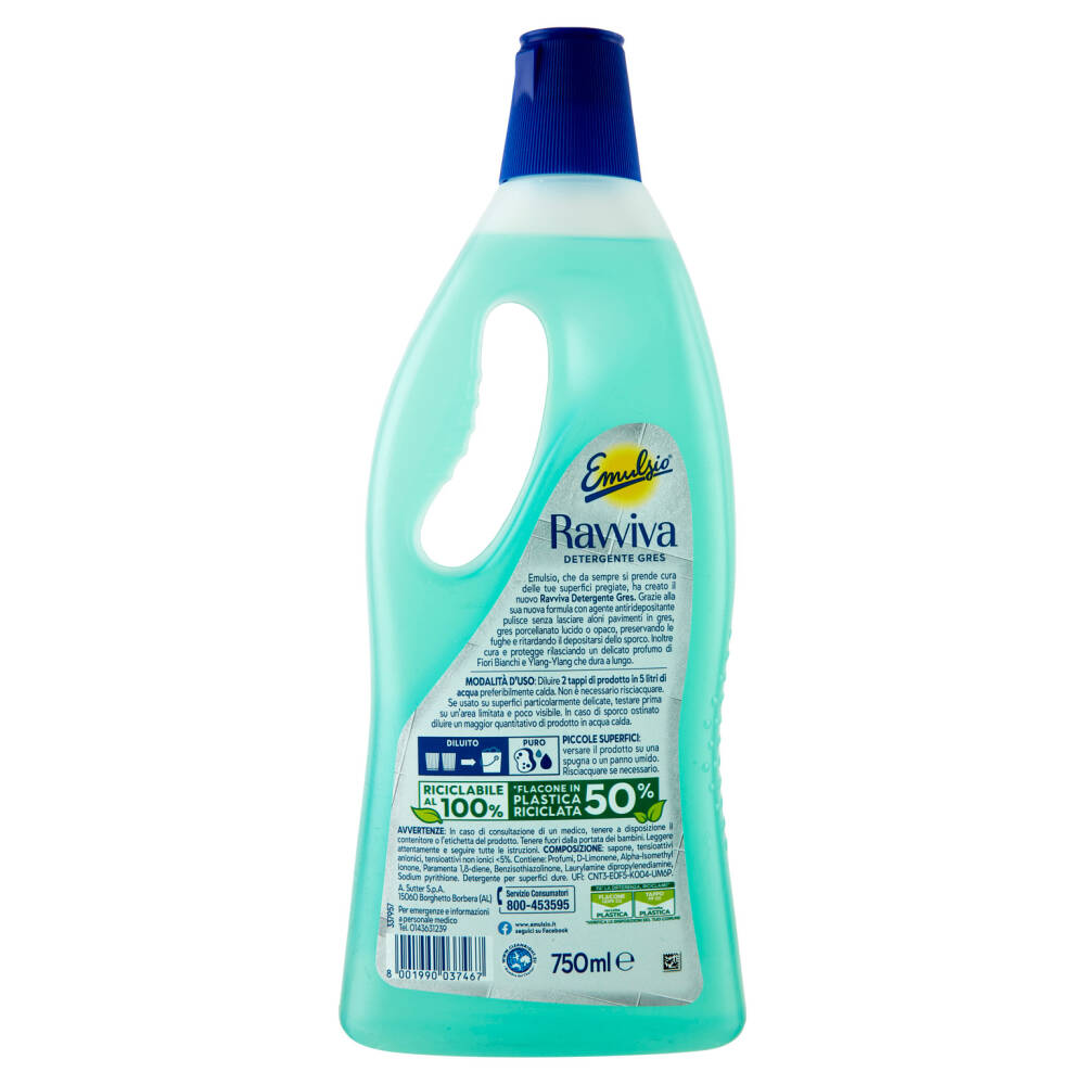 Emulsio, che da sempre si prende cura delle tue superfici pregiate, ha creato il nuovo Ravviva Detergente Gres. Grazie alla sua nuova formula con agente antiridepositante pulisce senza lasciare aloni pavimenti in gres, gres porcellanato lucido o opaco, preservando le fughe e ritardando il depositarsi dello sporco. Inoltre cura e protegge rilasciando un delicato profumo di Fiori Bianchi e Ylang-Ylang che dura a lungo.