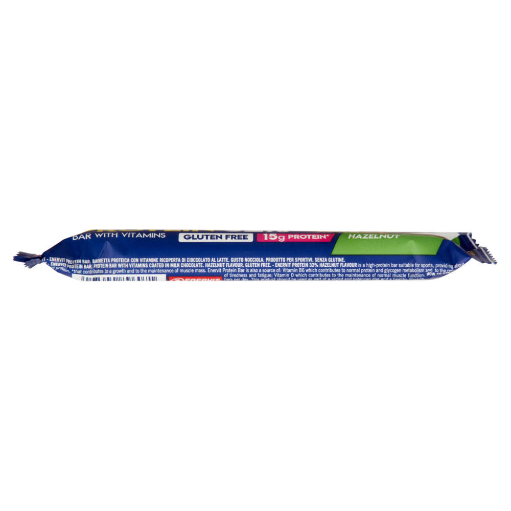 Enervit protein bar. Barretta proteica con vitamine ricoperta di cioccolato al latte. Gusto nocciola. Prodotto per sportivi. Senza glutine