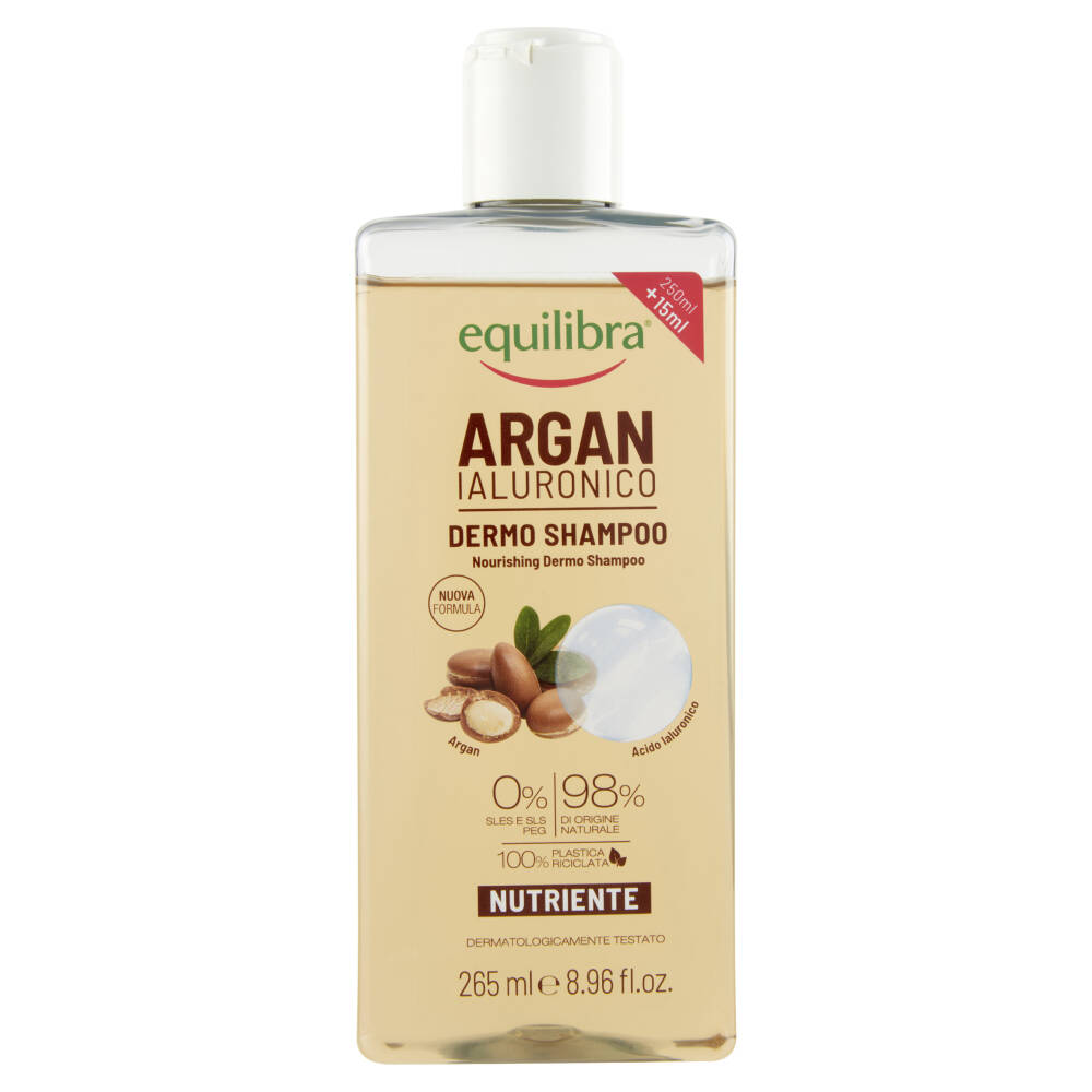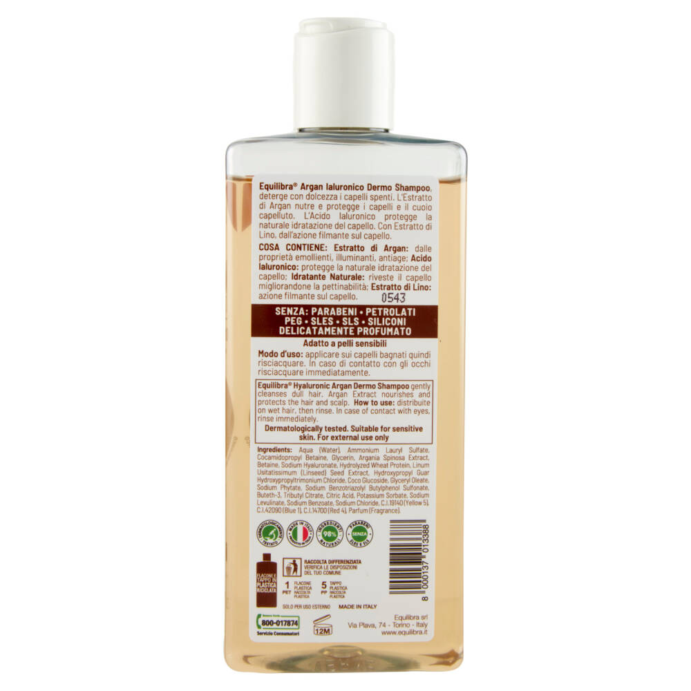 Equilibra Argan Ialuronico Dermo Shampoo, deterge con dolcezza i capelli spenti. L'Estratto di Argan nutre e protegge i capelli e il cuoio capelluto. L'Acido Ialuronico protegge la naturale idratazione del capello. Con Estratto di Lino, dall'azione filmante sul capello.