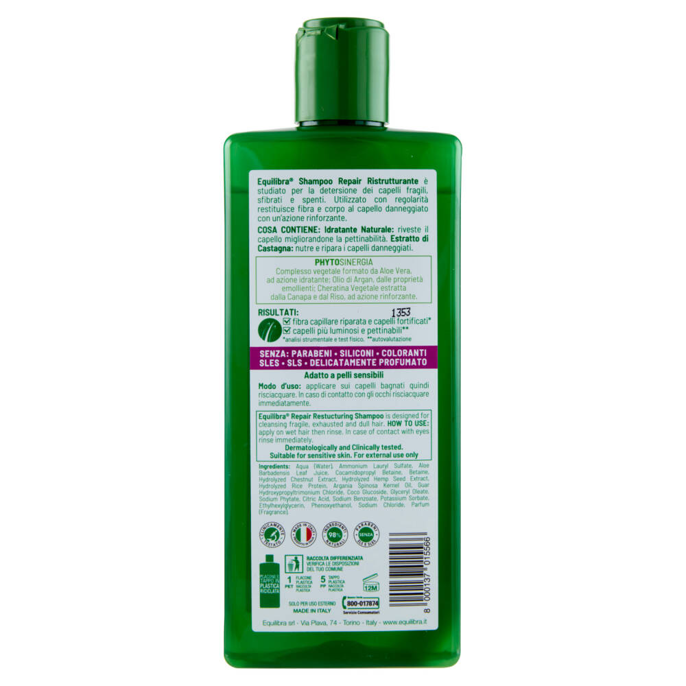Equilibra Shampoo Repair Ristrutturante è studiato per la detersione dei capelli fragili, sfibrati e spenti. Utilizzato con regolarità restituisce fibra e corpo al capello danneggiato con un'azione rinforzante.