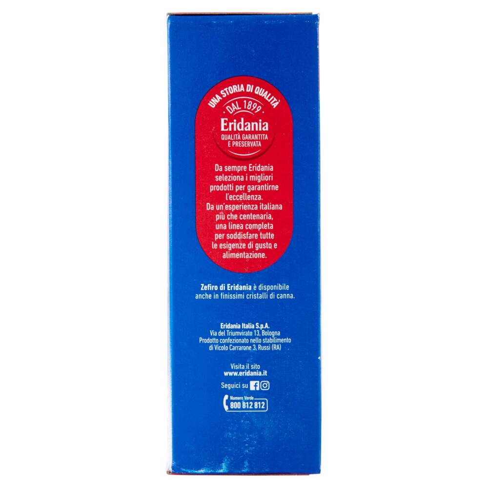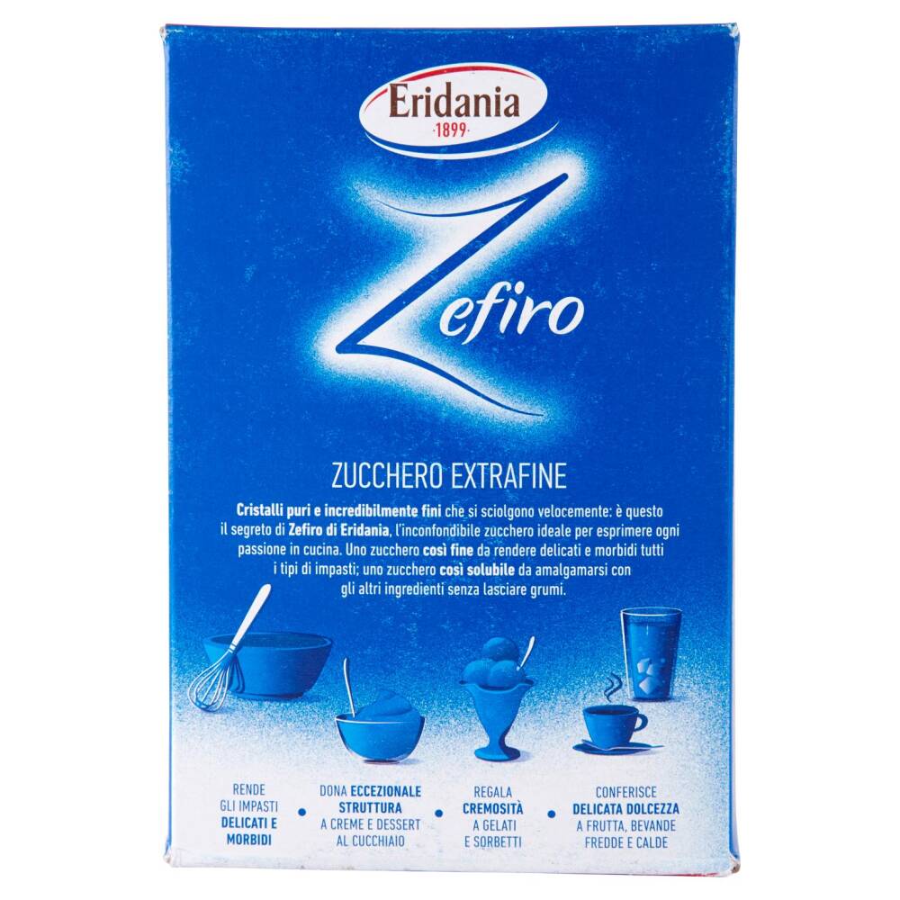 Cristalli puri e incredibilmente fini che si sciolgono velocemente: è questo il segreto di Zefiro di Eridania, l'inconfondibile zucchero ideale per esprimere ogni passione in cucina. Uno zucchero così fine da rendere delicati e morbidi tutti i tipi di impasti; uno zucchero così solubile da amalgamarsi con gli altri ingredienti senza lasciare grumi.