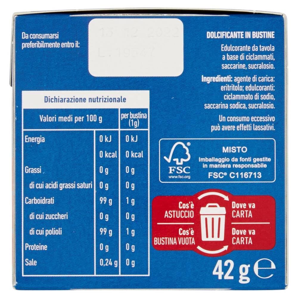 Agente di carica: ertritolo Edulcoranti: ciclammato di sodio, saccarina sodica, sucralosio Un consumo eccessivo può avere effetti lassativi