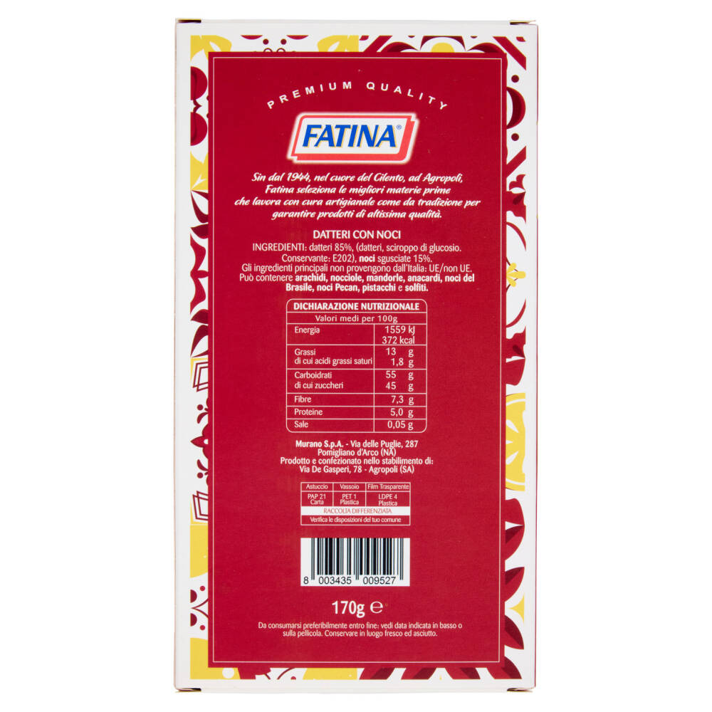 Datteri 85%, (datteri, sciroppo di glucosio. Conservante: E202) Noci sgusciate 15% Può contenere arachidi, nocciole, mandorle, anacardi, noci del Brasile, noci Pecan, pistacchi e solfiti