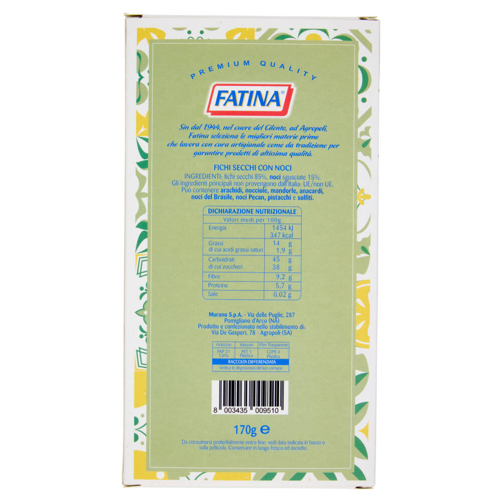 Fichi secchi 85% Noci sgusciate 15% Può contenere arachidi, nocciole, mandorle, anacardi, noci del Brasile, noci Pecan, pistacchi e solfiti