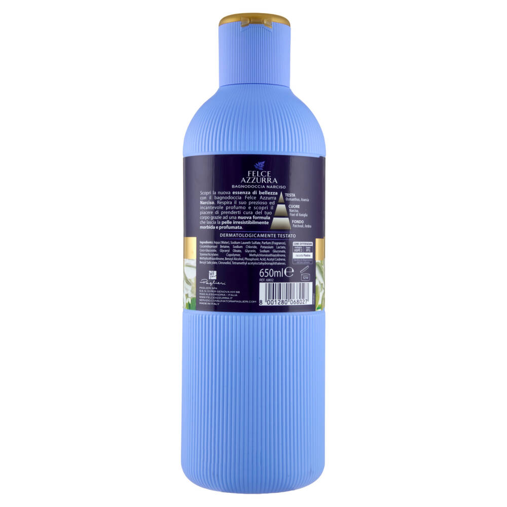 Scopri la nuova essenza di bellezza con il bagnodoccia Felce Azzurra Narciso. Respira il suo prezioso ed incantevole profumo e scopri il piacere di prenderti cura del tuo corpo grazie ad una nuova formula che lascia la pelle irresistibilmente morbida e profumata.