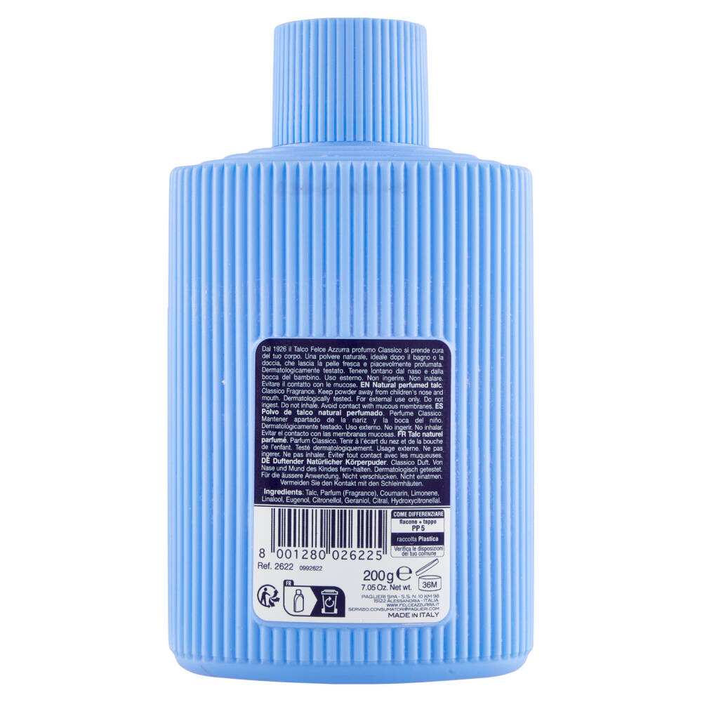 Dal 1926 il Talco Felce Azzurra profumo Classico si prende cura del tuo corpo. Una polvere naturale, ideale dopo il bagno o la doccia, che lascia la pelle fresca e piacevolmente profumata. Dermatologicamente testato.