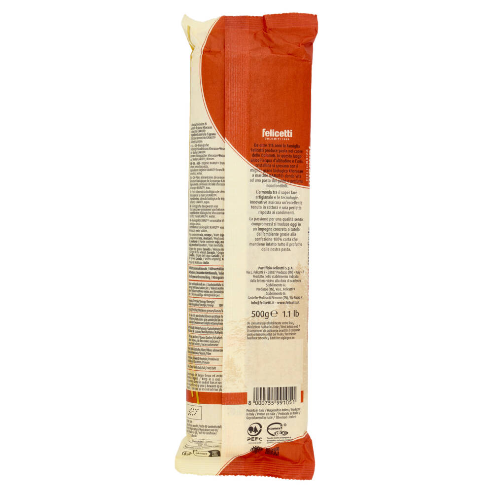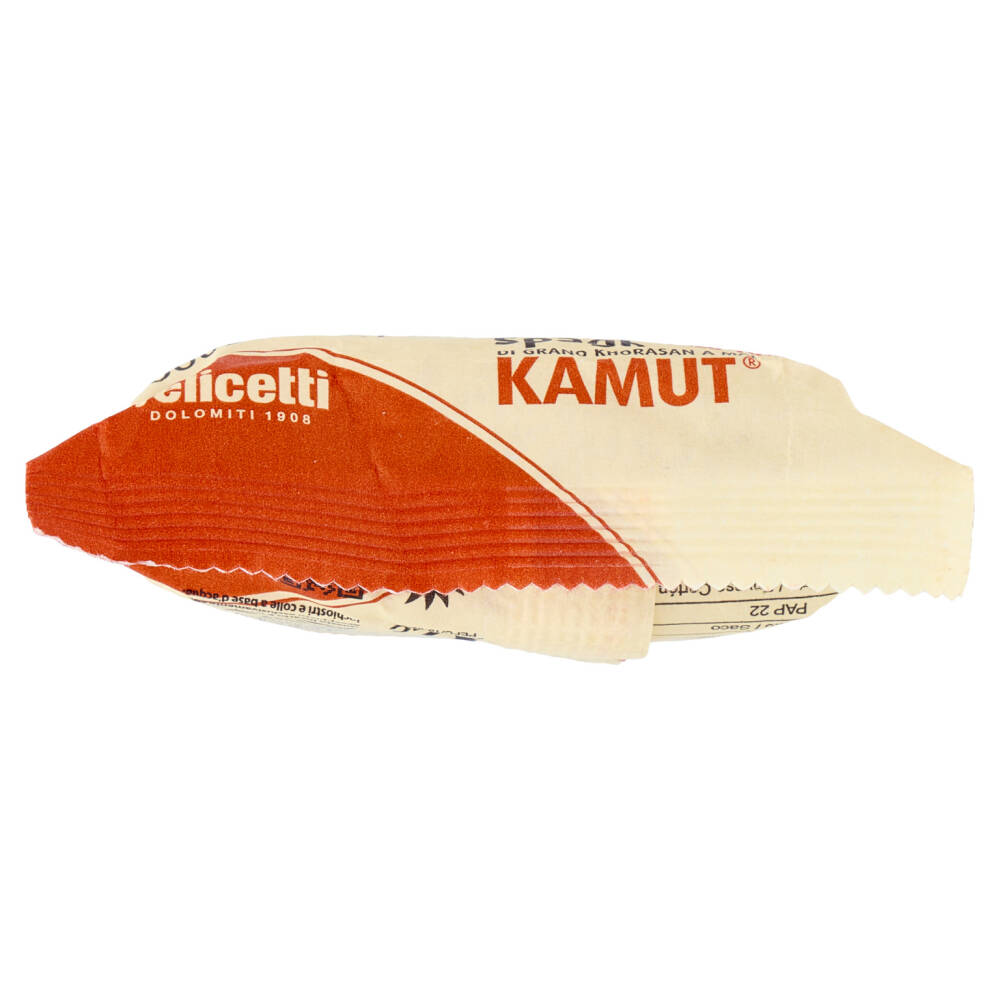 100% Confezione solo carta Solo acqua pura dalle nostre Dolomiti e grano khorasan a marchio Kamut biologico Trafila al bronzo 105 Origine del grano: Canada Pensata per gli chef In pentola: 11'