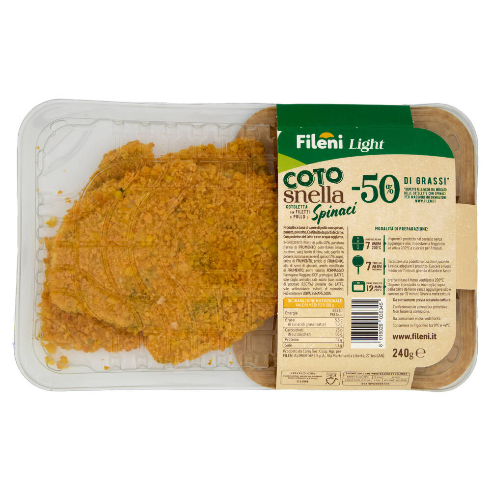 Non fritta -50% di grassi* - Pollo a lenta crescita - Pollo allevato senza uso di antibiotici - Pollo 100% italiano Friggitrice ad aria 7 min 200°C Padella 7 min Forno ventilato 12 min 200°C Vaschetta 50% di plastica riciclata *Rispetto alla media del mercato delle cotolette con spinaci. Per maggiori informazioni www.fileni.it