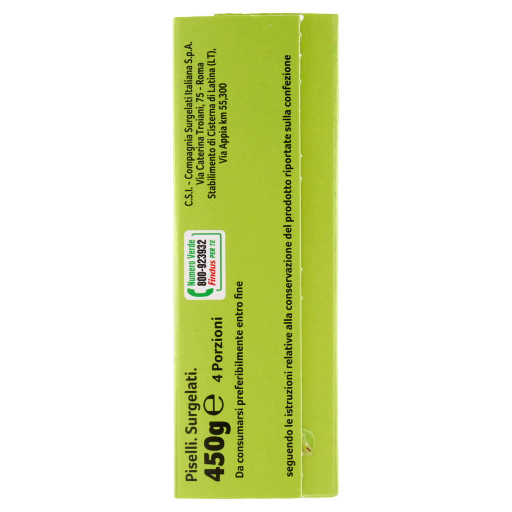Come si preparano Il prodotto è da consumarsi previa cottura. Non occorre scongelare. 4½ Min - In microonde: versa 100g di piselli, ancora surgelati, in un contenitore adatto al microonde, aggiungi 4 cucchiai d'acqua, copri con un coperchio e prepara il prodotto come indicato in tabella; a fine preparazione elimina l'acqua in eccesso: Tempo totale: 4½ min 600W | 4 min 1000W Se prepari un quantitativo maggiore di piselli, l'acqua e i tempi di preparazione aumentano. 7 Min - In pentola: versa i piselli ancora surgelati in una pentola con poca acqua bollente. Riporta a bollore e lascia cuocere da quel momento per 7 minuti e comunque secondo il grado di cottura preferito.