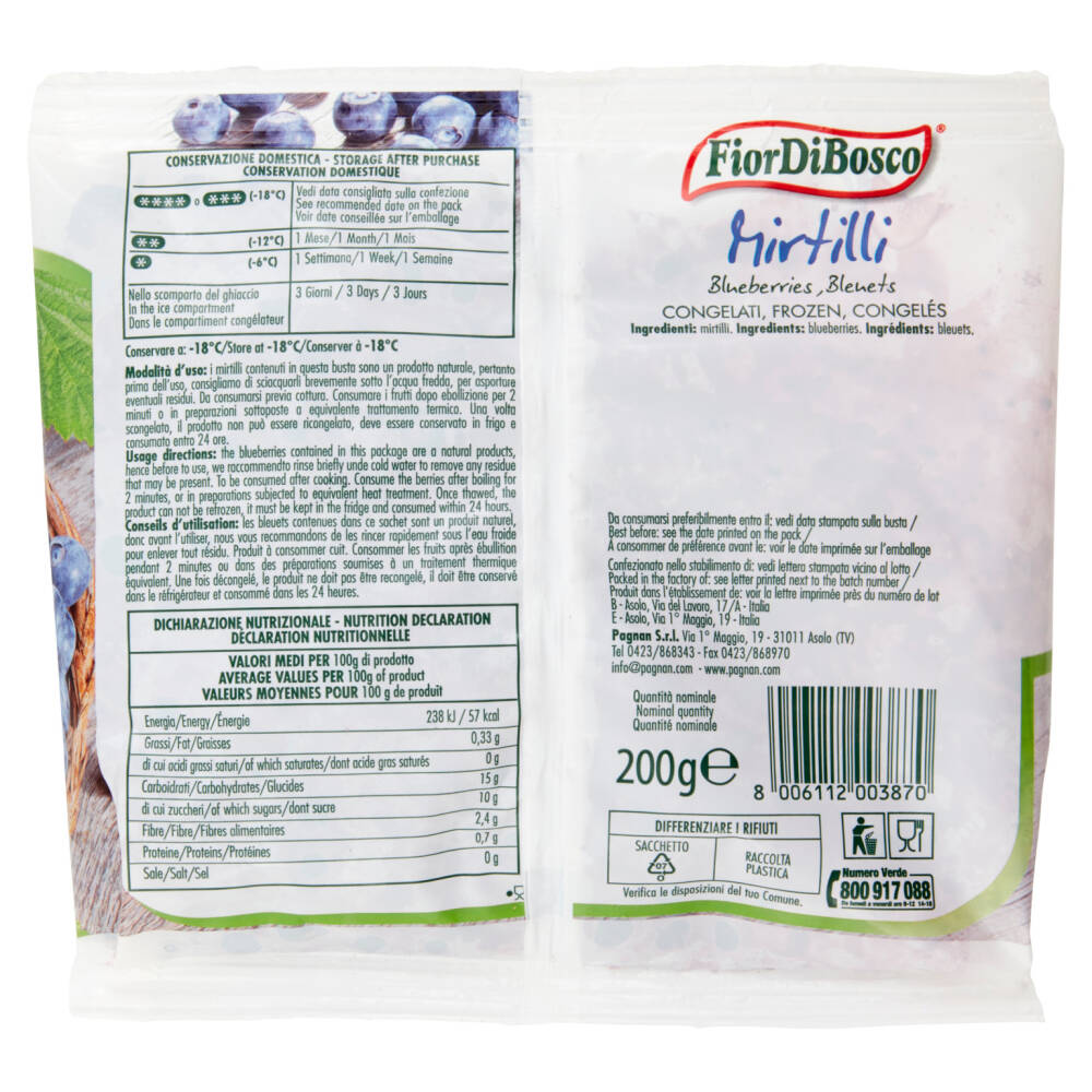 Modalità d'uso: i mirtilli contenuti in questa busta sono un prodotto naturale, pertanto prima dell'uso, consigliamo di sciacquarli brevemente sotto l'acqua fredda, per asportare eventuali residui. Da consumarsi previa cottura. Consumare i frutti dopo ebollizione per 2 minuti o in preparazioni sottoposte a equivalente trattamento termico. Una volta scongelato, il prodotto non può essere ricongelato, deve essere conservato in frigo e consumato entro 24 ore.