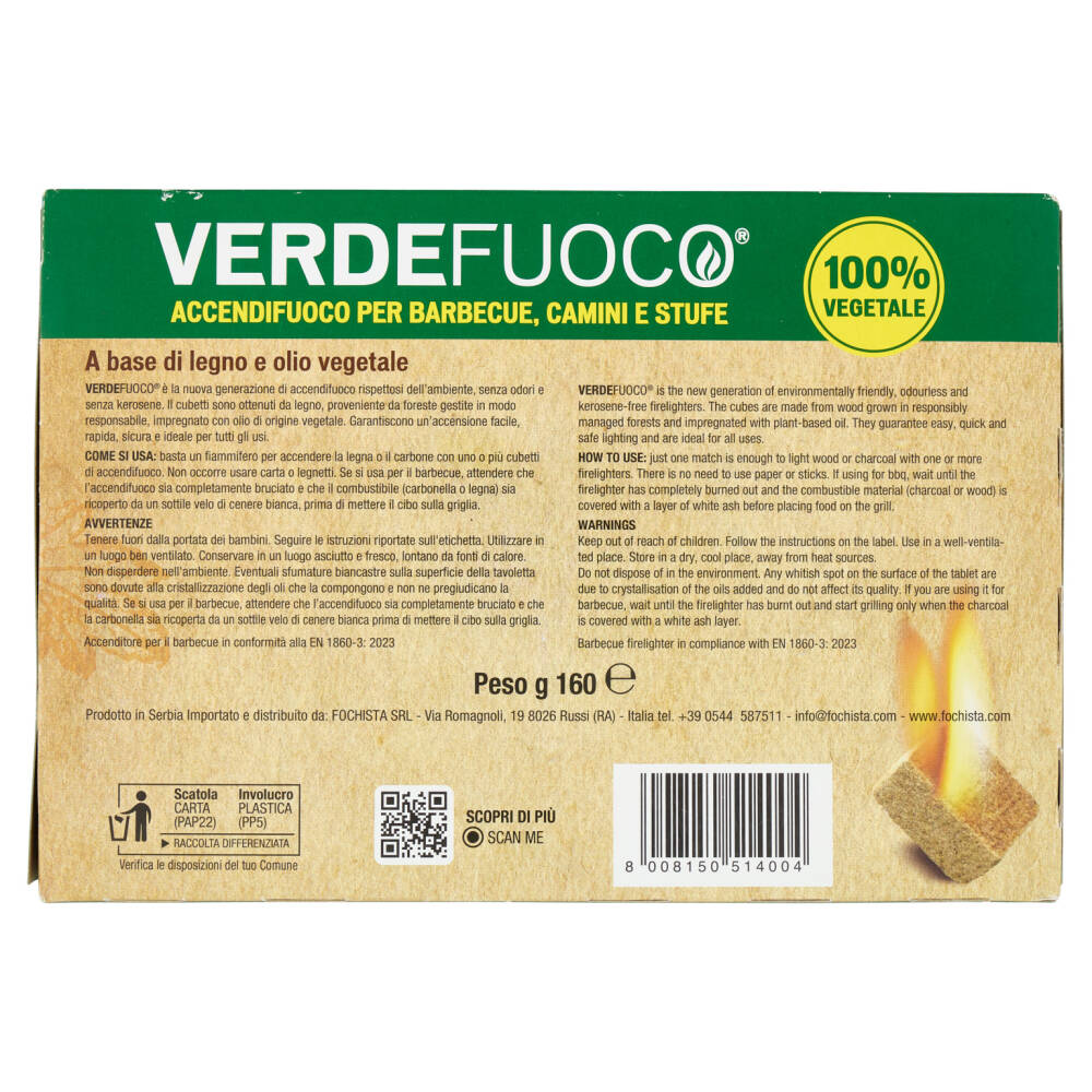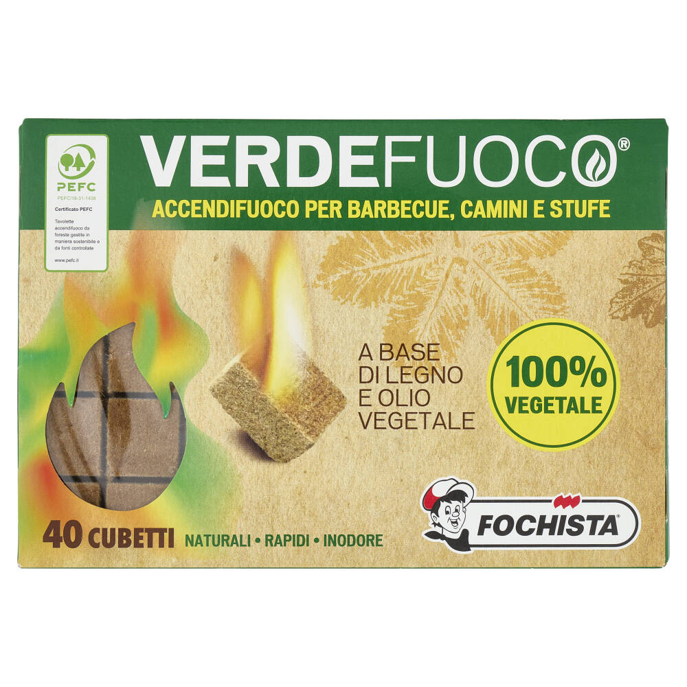 Verdefuoco è la nuova generazione di accendifuoco rispettosi dell'ambiente, senza odori e senza kerosene. Il cubetti sono ottenuti da legno, proveniente da foreste gestite in modo responsabile, impregnato con olio di origine vegetale. Garantiscono un'accensione facile, rapida, sicura e ideale per tutti gli usi.