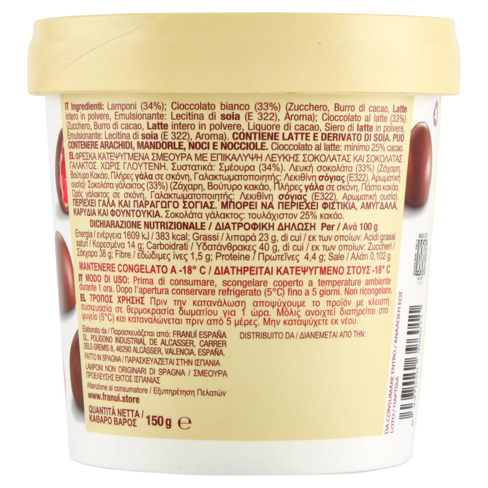 Lamponi (34%) Cioccolato bianco (33%) (zucchero, burro di cacao, latte intero in polvere, emulsionante: lecitina di soia (E 322), aroma) Cioccolato al latte (33%) (zucchero, burro di cacao, latte intero in polvere, liquore di cacao, siero di latte in polvere, emulsionante: lecitina di soia (E 322), aroma CONTIENE LATTE E DERIVATO DI SOIA PUO' CONTENERE ARACHIDI, MANDORLE, NOCI E NOCCIOLE Cioccolato al latte: minimo 25% cacao
