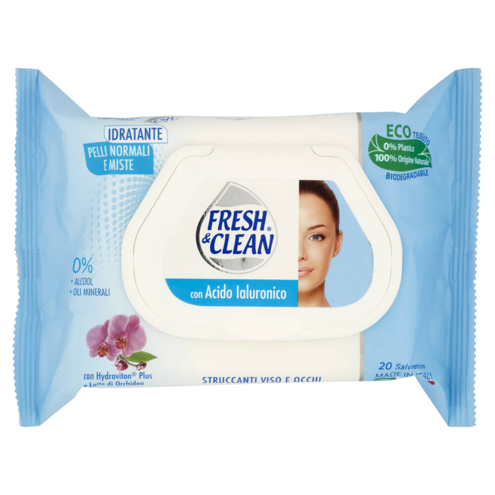Le salviettine struccanti Fresh & Clean detergono, idratano e rinfrescano la tua pelle ogni giorno. La nuova formula con Acido Ialuronico, uno dei componenti essenziali della pelle, e l'innovativo ingrediente Hydroviton Plus*, permette non solo una ottimale pulizia del viso, degli occhi e delle labbra, ma lascia anche la pelle particolarmente idratata, elastica e morbida.
