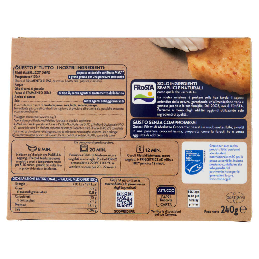 *specie di pesce utilizzata: vedi la lettera riportata sul lato della confezione: A=Merluzzo d'Alaska pescato nell'Oceano Pacifico Nord-Orientale (FAO 67) o Nord-Occidentale (FAO 61) con reti da traino B= Merluzzo carbonaro pescato nell'Atlantico Nord-Orientale (FAO 27) con reti da traino, reti da circuizione e reti da raccolta, reti da imbrocco e reti analoghe, sciabiche, ami e palangari C= Merluzzo australe pescato nell'Oceano Pacifico Sud-Occidentale (FAO81) con reti da trainoAllergeni
