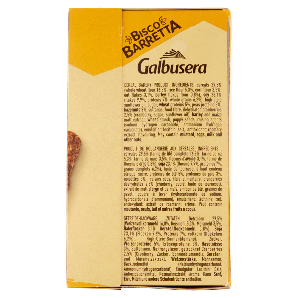 Contiene Orzo, Potrebbe contenere Uova, Contiene Nocciole, Potrebbe contenere Latte, Potrebbe contenere Senape, Contiene Avena, Contiene Soia, Potrebbe contenere Frutta a guscio, Contiene Grano/FrumentoAltro testo relativo ad allergeni