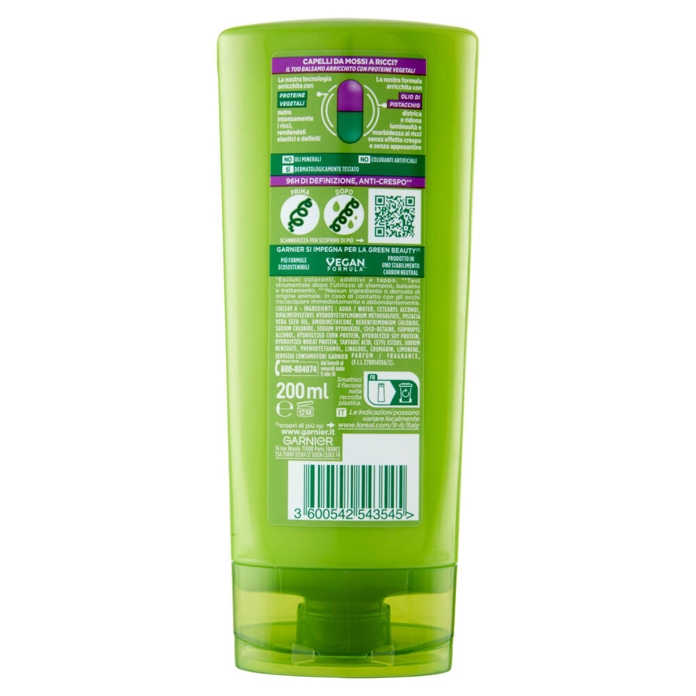 100% Plastica riciclata* Olio di pistacchio Nuovo 96h di definizione, anti-crespo** Proteine vegetali *Esclusi coloranti, additivi e tappo **Test strumentale dopo l'utilizzo di shampoo, balsamo e trattamento