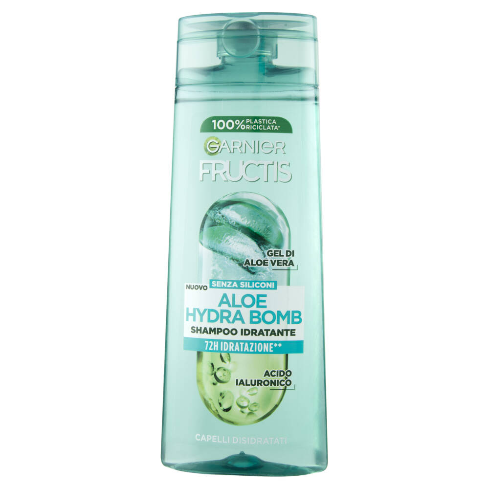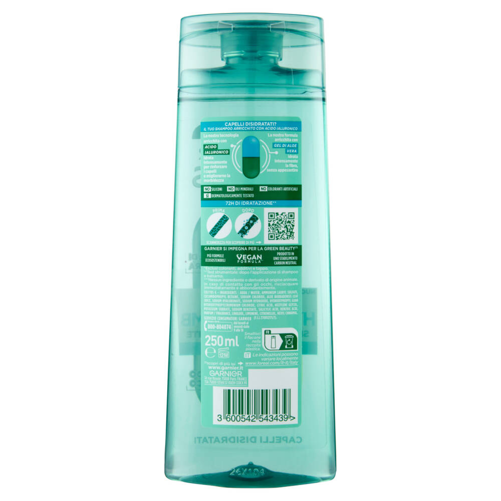 100% Plastica riciclata* Gel di aloe vera Senza siliconi Nuovo 72h Idratazione** Acido ialuronico *Esclusi coloranti, additivi e tappo **Test strumentale: dopo l'applicazione di shampoo e balsamo