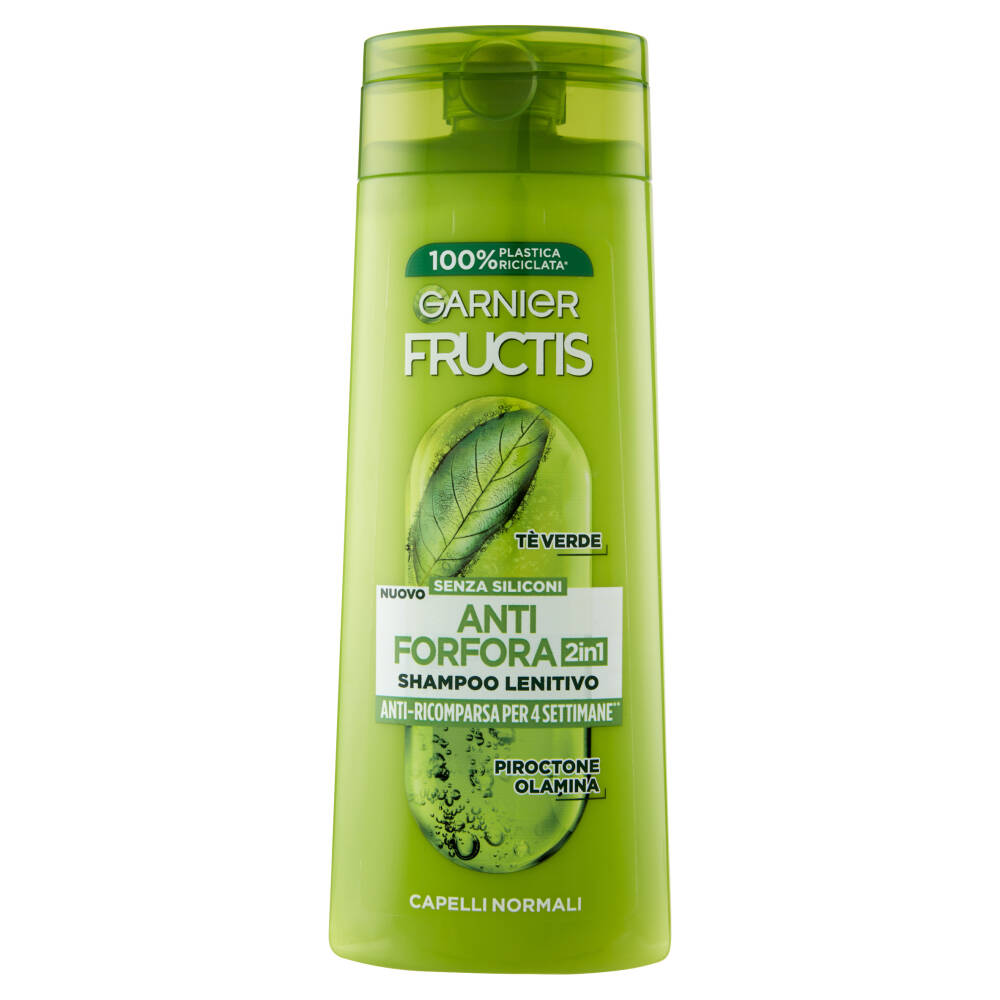 100% Plastica riciclata* Tè verde Senza siliconi Nuovo Anti-ricomparsa per 4 settimane** Piroctone olamina *Esclusi coloranti, additivi e tappo **Test cosmetoclinico