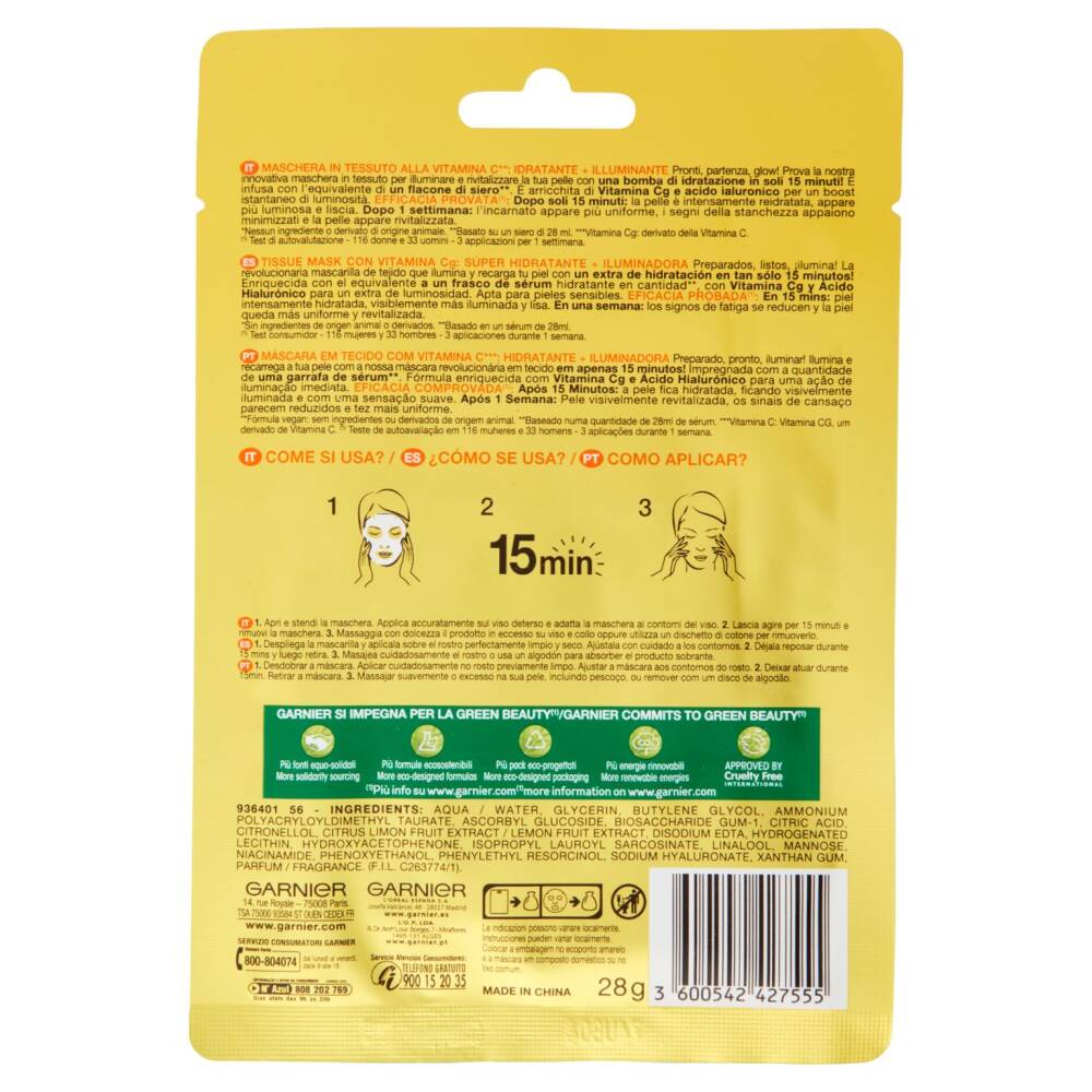 Pronti, partenza, glow! Prova la nostra innovativa maschera in tessuto per illuminare e rivitalizzare la tua pelle con una bomba di idratazione in soli 15 minuti! È infusa con l'equivalente di un flacone di siero**. È arricchita di Vitamina Cg e acido ialuronico per un boost istantaneo di luminosità. Efficacia provata⁽¹⁾: Dopo soli 15 minuti: la pelle è intensamente reidratata, appare più luminosa e liscia. Dopo 1 settimana: l'incarnato appare più uniforme, i segni della stanchezza appaiono minimizzati e la pelle appare rivitalizzata.