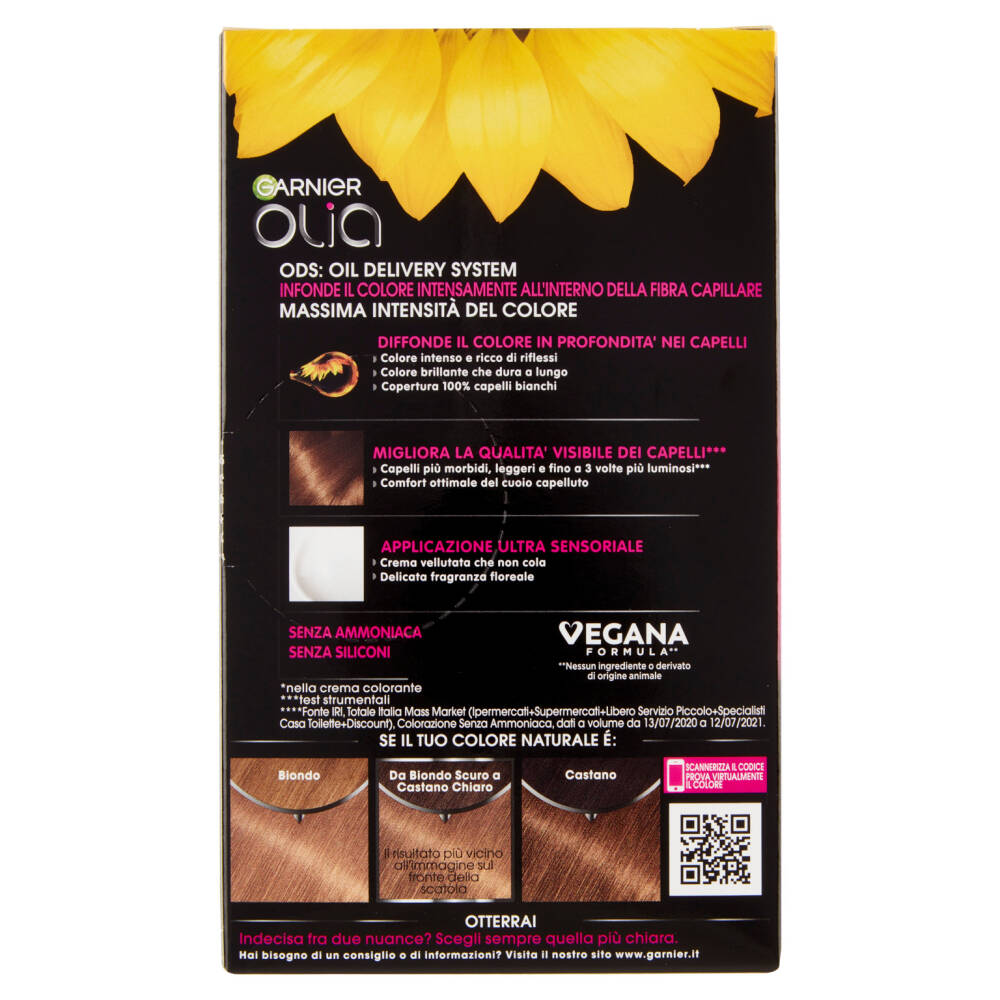 L'olio può essere più di un trattamento per i tuoi capelli. Per la prima volta Garnier lo ha concentrato nel cuore della sua formula per offrire un'intensità massima del colore e creare La Nuova Generazione del Colore Massima intensità del colore - Colore ricco e brillante - Tenuta a lunga durata Migliora la qualità visibile dei capelli - Più soffici, 35% più morbidi** Applicazione sensoriale unica - Comfort ottimale del cuoio capelluto - Crema vellutata che non cola - Delicata fragranza floreale **Test strumentali. Applicazione Sensoriale Unica & Facile Con Olia, colorare i tuoi capelli è facile e piacevole: - Mescola il Rivelatore in Crema e la Crema Colorante nell'ampolla Olia - Applica la miscela dalla delicata fragranza floreale - Usa il nuovo trattamento Balsamo Luce&Seta riutilizzabile per mantenere i tuoi capelli soffici e brillanti Hai bisogno di consigli o informazioni? Leggi il codice QR per accedere a video, tutorial e consigli personalizzati, oppure visita il nostro sito internet www.garnier.it/olia