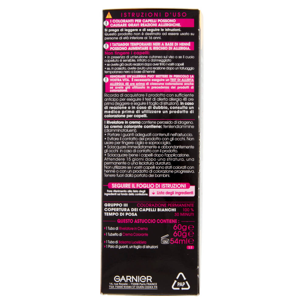 Nuovo trattamento Tecnologia innovativa 60% di Oli* Con Oli Naturali di Fiori Senza ammoniaca 3 Volte più luminoso** Massima intensità del colore Copre il 100 % dei capelli bianchi Migliora la qualità visibile dei capelli** Comfort ottimale del cuoio capelluto *Nella crema colorante **Test strumentali