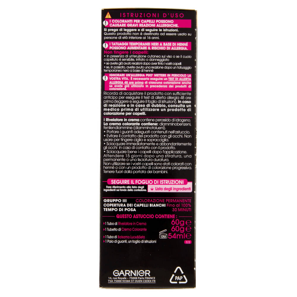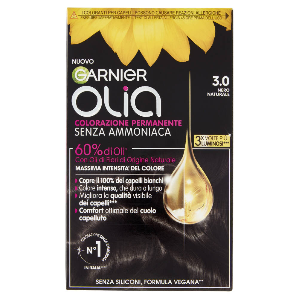 Nuovo 3.0 Nero naturale Colorazione permanente 3x Volte più luminosi*** 60% di Oli* Con Oli di Fiori di Origine Naturale Massima intensità del colore - Copre il 100% dei capelli bianchi - Colore intenso, che dura a lungo - Migliora la qualità visibile dei capelli*** - Comfort ottimale del cuoio capelluto Colorazione senza ammoniaca N°1 in Italia**** Senza siliconi, formula vegana** *nella crema colorante **Nessun ingrediente o derivato di origine animale ***test strumentali ****Fonte IRI, Totale Italia Mass Market (Ipermercati+Supermercati+Libero Servizio Piccolo+Specialisti Casa Toilette+Discount), Colorazione Senza Ammoniaca, dati a volume da 13/07/2020 a 12/07/2021