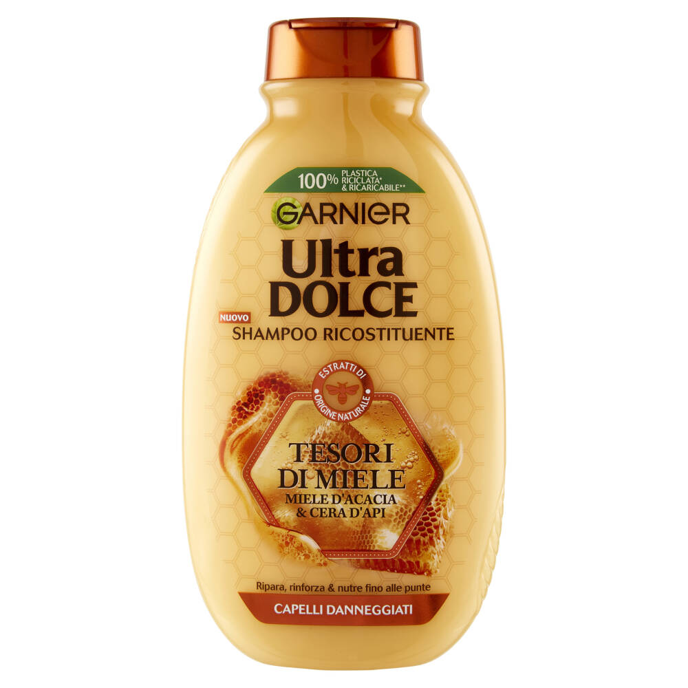 100% Plastica riciclata* & ricaricabile** Nuovo Shampoo ricostituente Estratti di origine naturale Miele d'acacia & cera d'api Ripara, rinforza & nutre fino alle punte *flacone in plastica 100% riciclata, esclusi coloranti, additivi e tappo **Rifiuti di plastica abbandonata localizzati entro 50km dalla costa che andrebbero dispersi nell'oceano