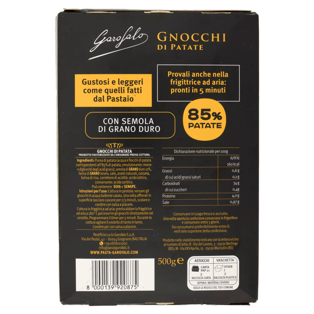 Purea di patata (acqua e fiocchi di patata corrispondenti all'85% di patata, emulsionante: mono- e digliceridi degli acidi grassi) Semola di grano duro 10% Farina di grano tenero Sale Aromi naturali Curcuma Farina di riso Correttore di acidità: acido lattico Conservante: acido sorbico Può contenere soia e senape